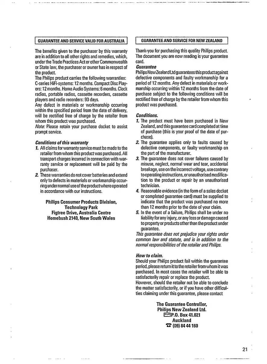 Philips AW 7530 - GUARANTEE AND SERVICE VALID FOR AUSTRALIA; GUARANTEE AND SERVICE FOR NEW ZEALAND