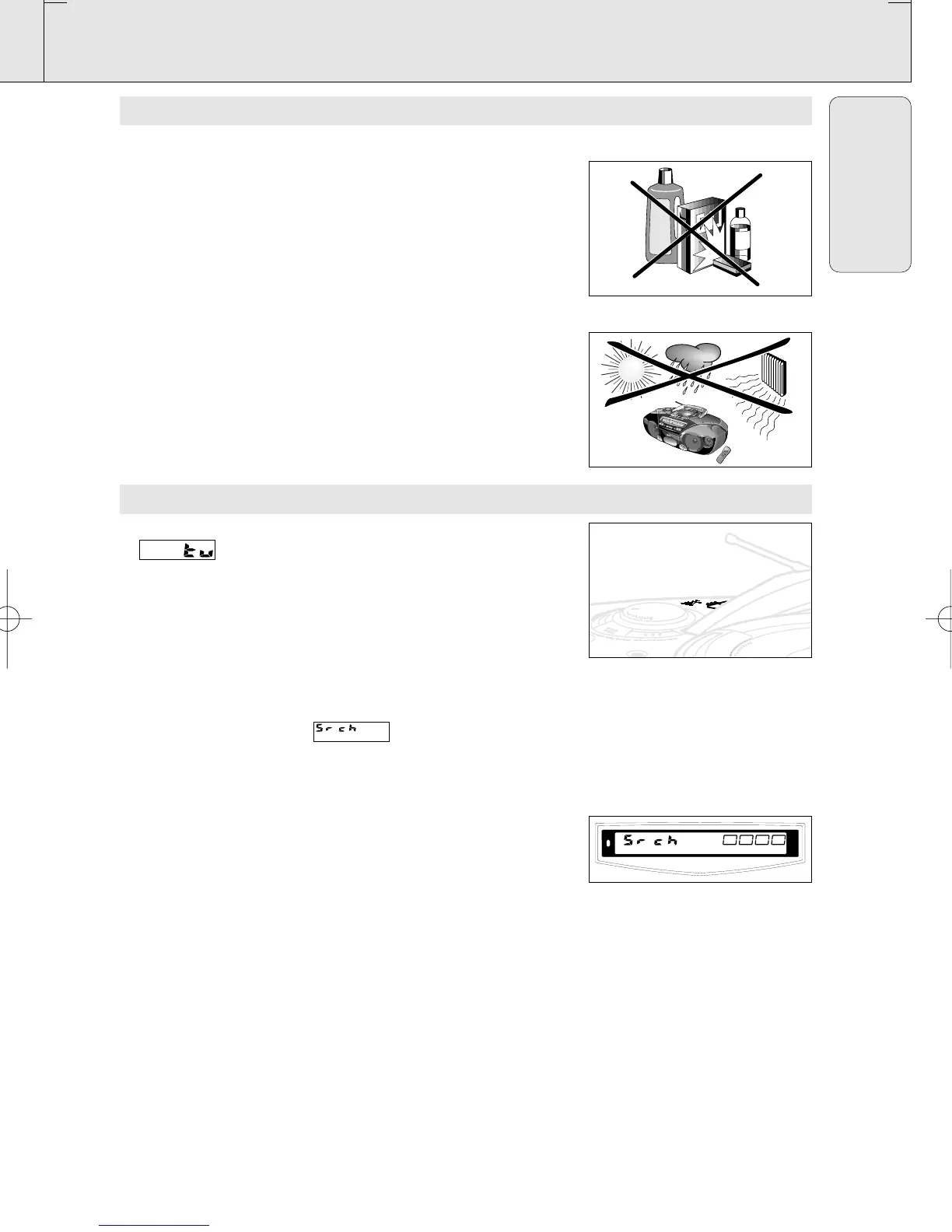 • Do not expose the set, batteries, CDs or cassettes to humidity,