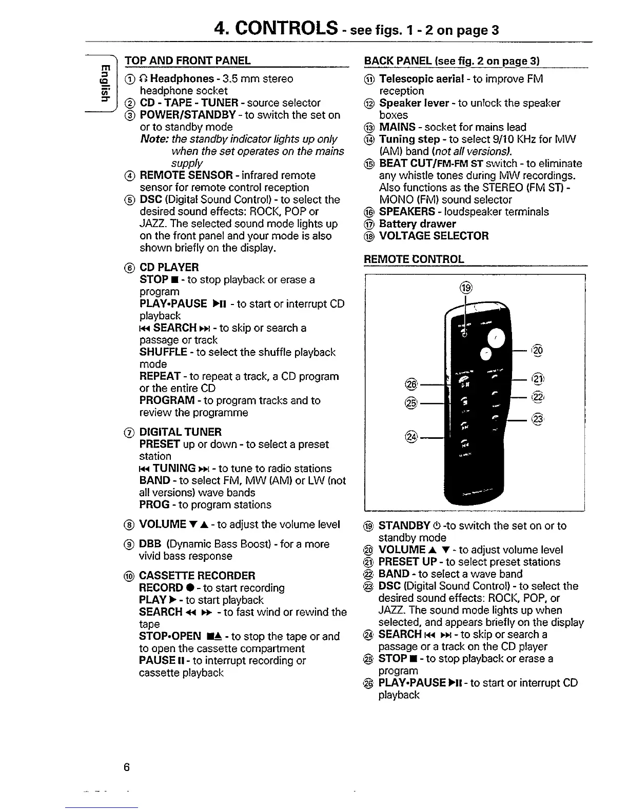 Philips AZ 2405 - System Controls; Control Panel Layout; Remote Control Operation