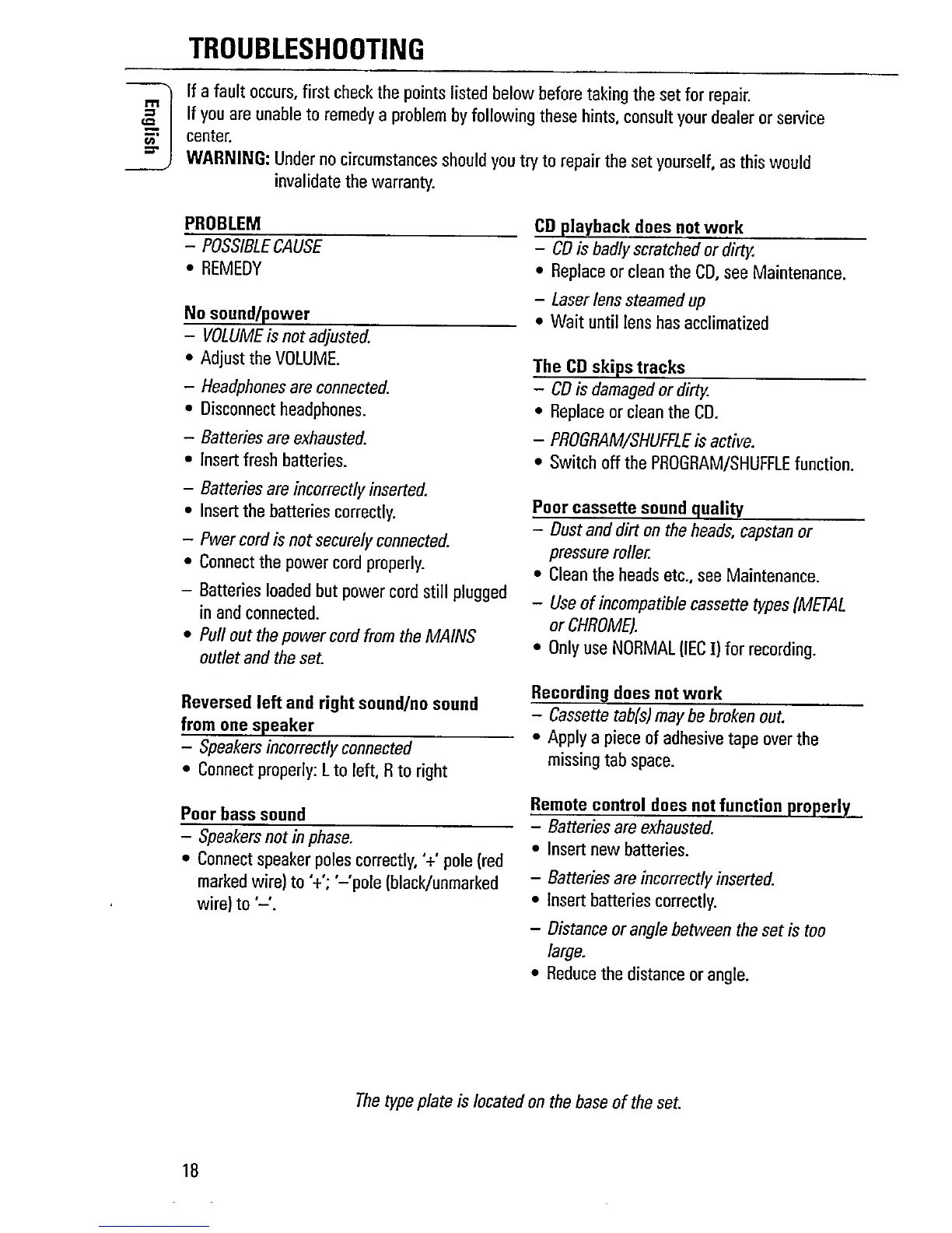 Philips AZ 2407 - Troubleshooting Common Issues; No Sound or Power Problems; Audio Output and Speaker Issues; CD Playback and Skipping