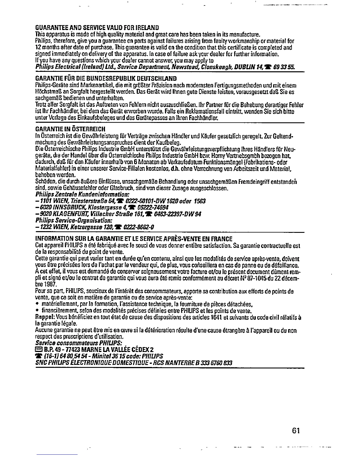 Philips AZ 6811 - Guarantee and Service: Ireland, Germany, Austria, France; Ireland Warranty and Service; Germany Warranty and Service; Austria Warranty and Service