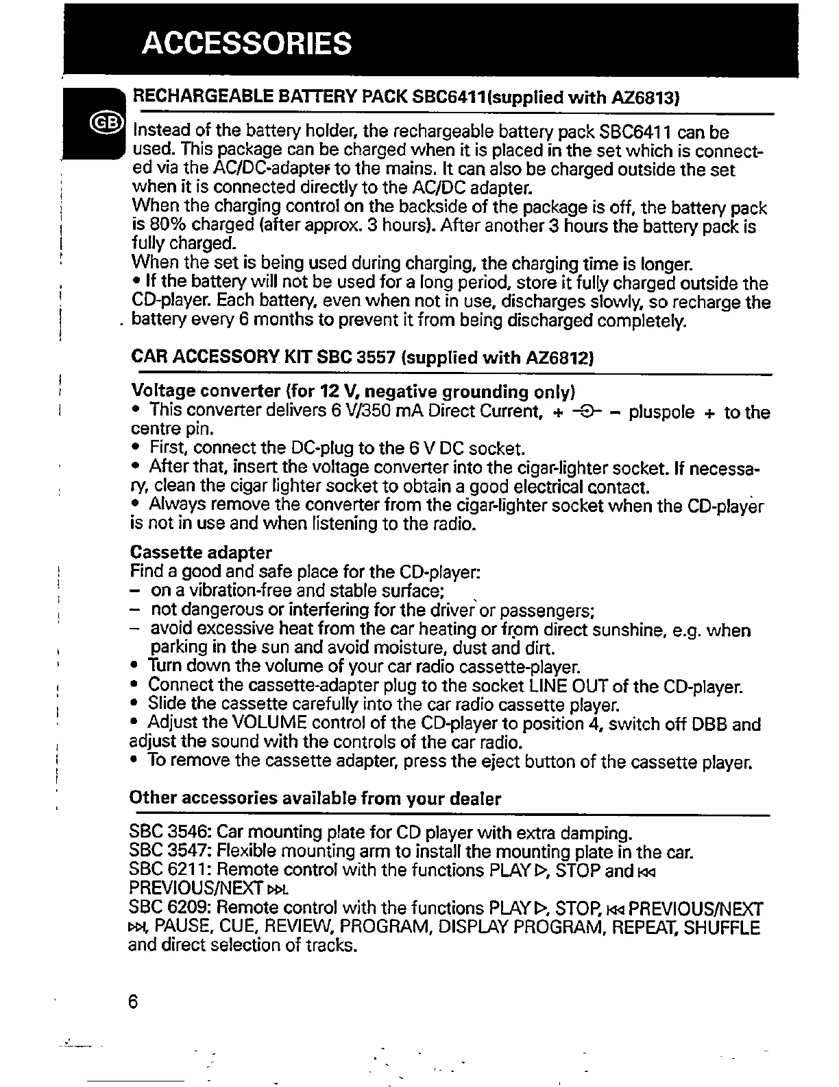 Philips AZ 6813 - Optional Accessories; Rechargeable Battery Pack; Car Accessory Kit; Additional Accessories