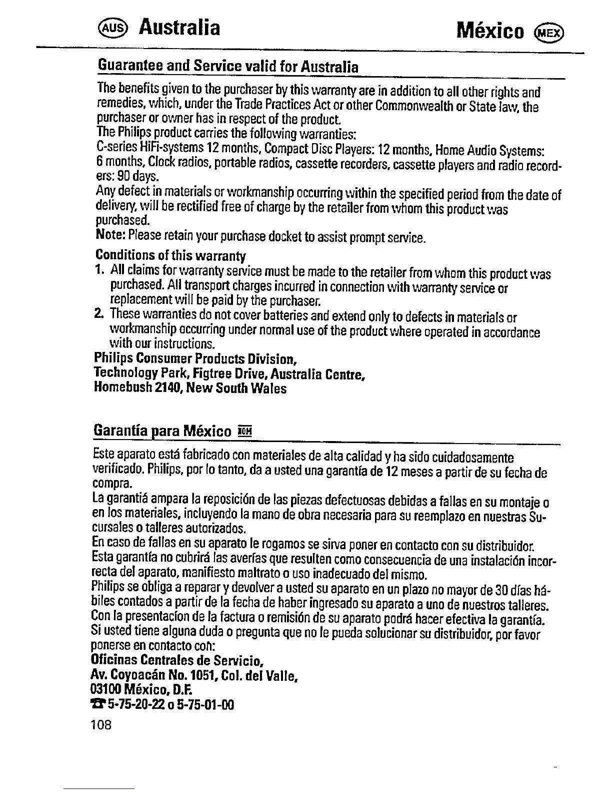 Philips AZ 6822 - Warranty and Service Information; Australia Guarantee and Service Details; Mexico Warranty and Service Details