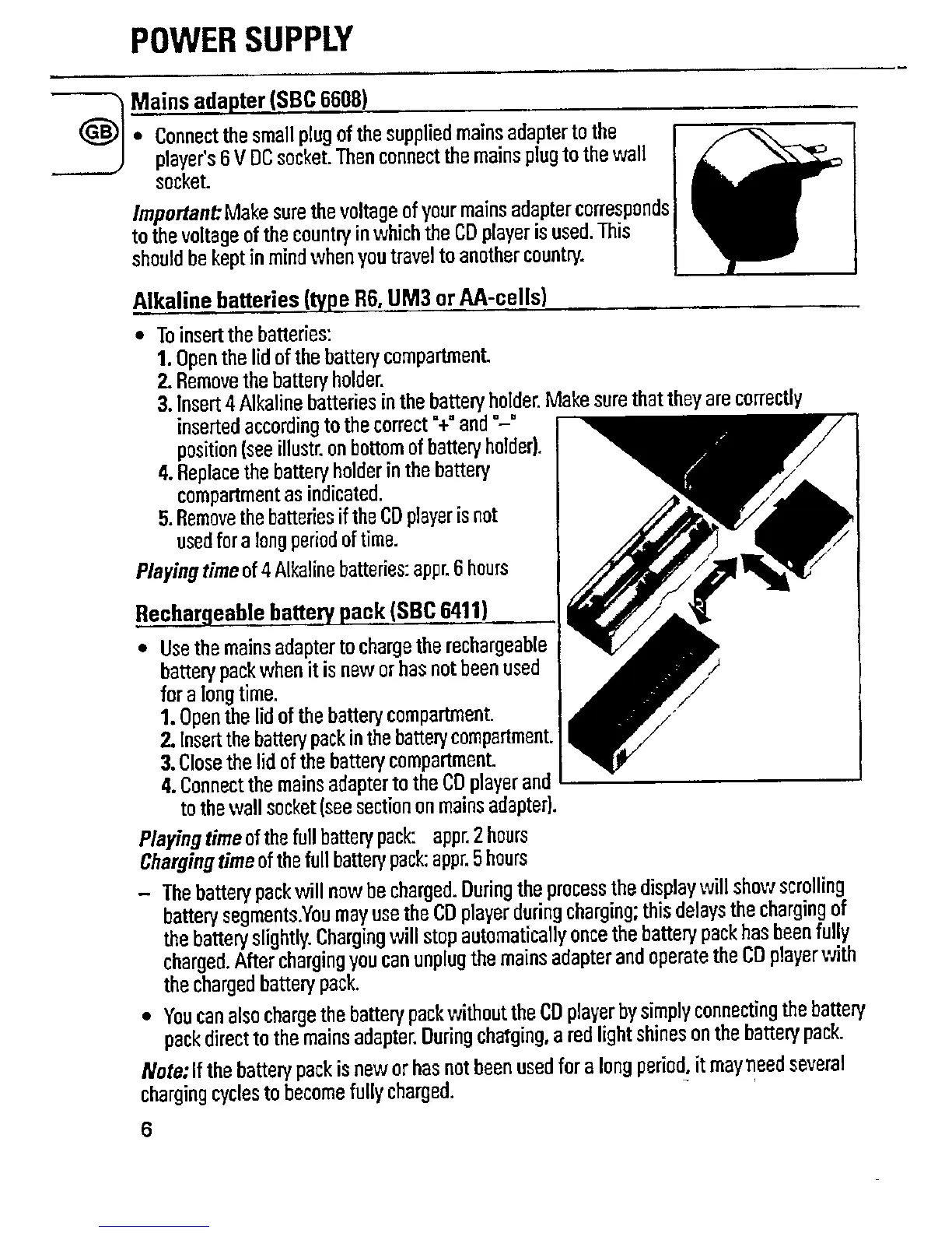 Philips AZ 6823 - Power Supply; Using the Mains Adapter; Battery Operation