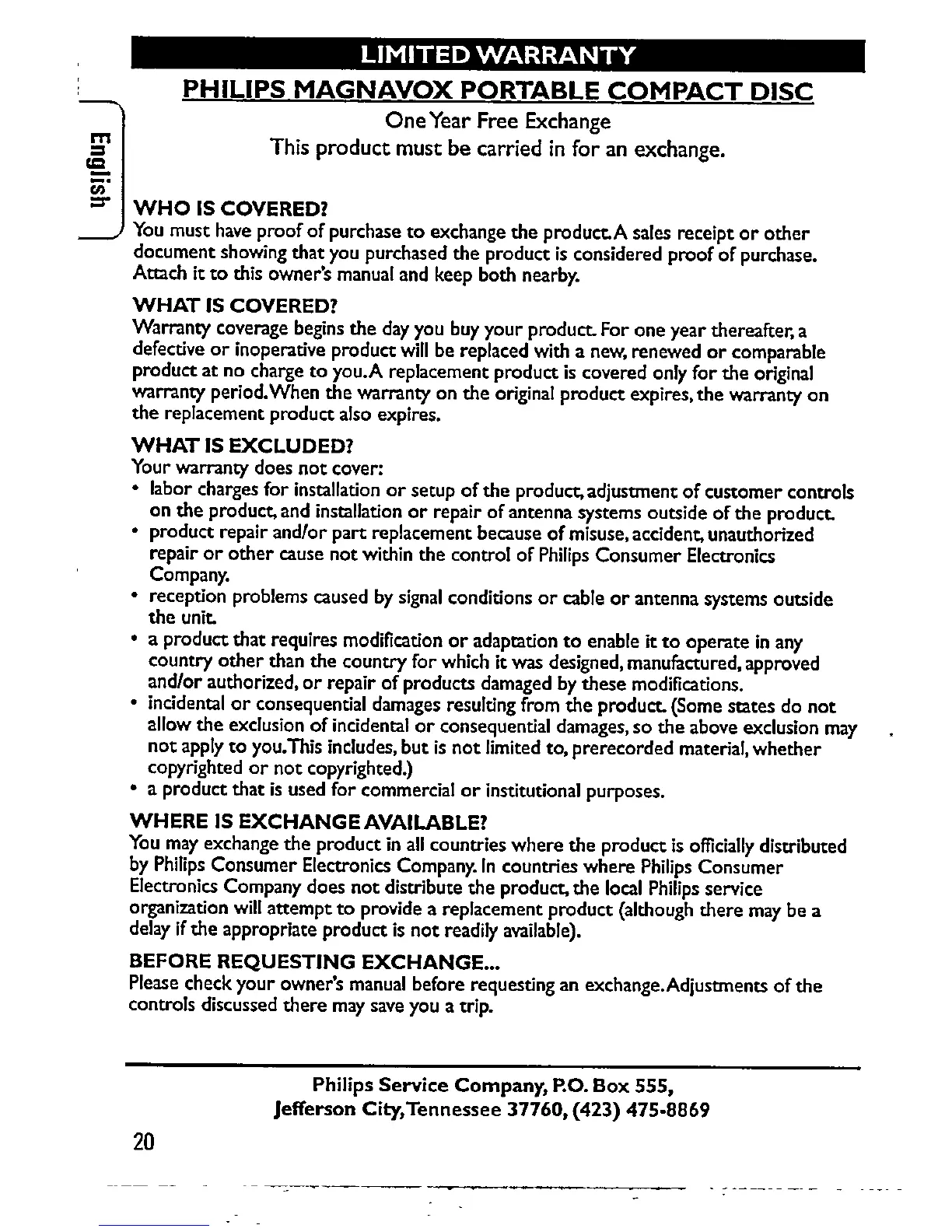 Philips AZ 7271 - LIMITED WARRANTY; Warranty Coverage Details; Exchange Procedures and Advice