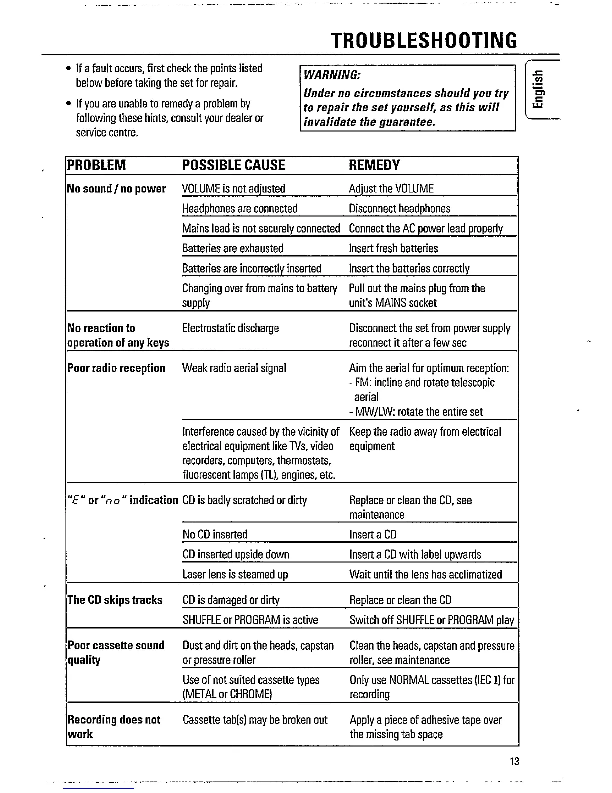 Philips AZ 8052 - Troubleshooting Common Problems; Power and Operational Faults; Radio and CD Playback Errors; Cassette and Recording Malfunctions