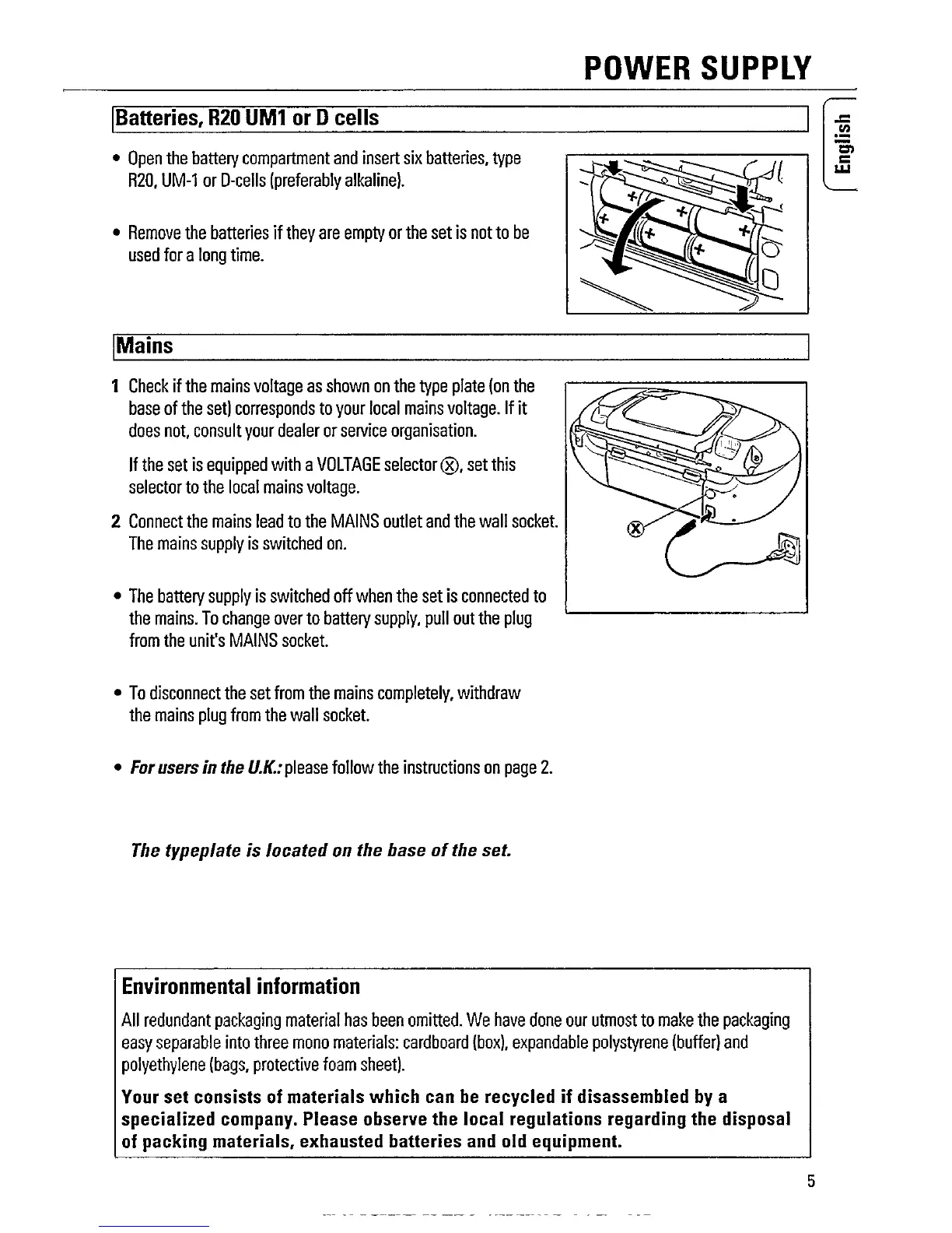 Philips AZ 8070 - Power Supply; Batteries; Mains; Environmental Information