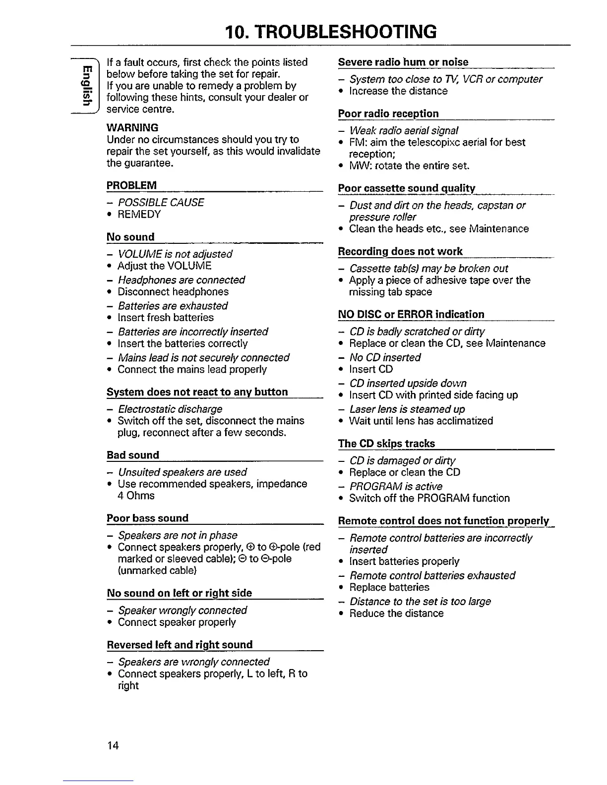 Philips AZ 9855 - Troubleshooting Common Issues; Radio, Sound, and Cassette Problems; CD Player and System Control Issues