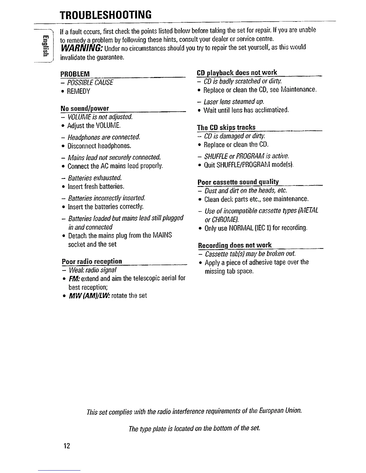 Philips AZ1020 - Troubleshooting Guide; Problem Diagnosis and Solutions
