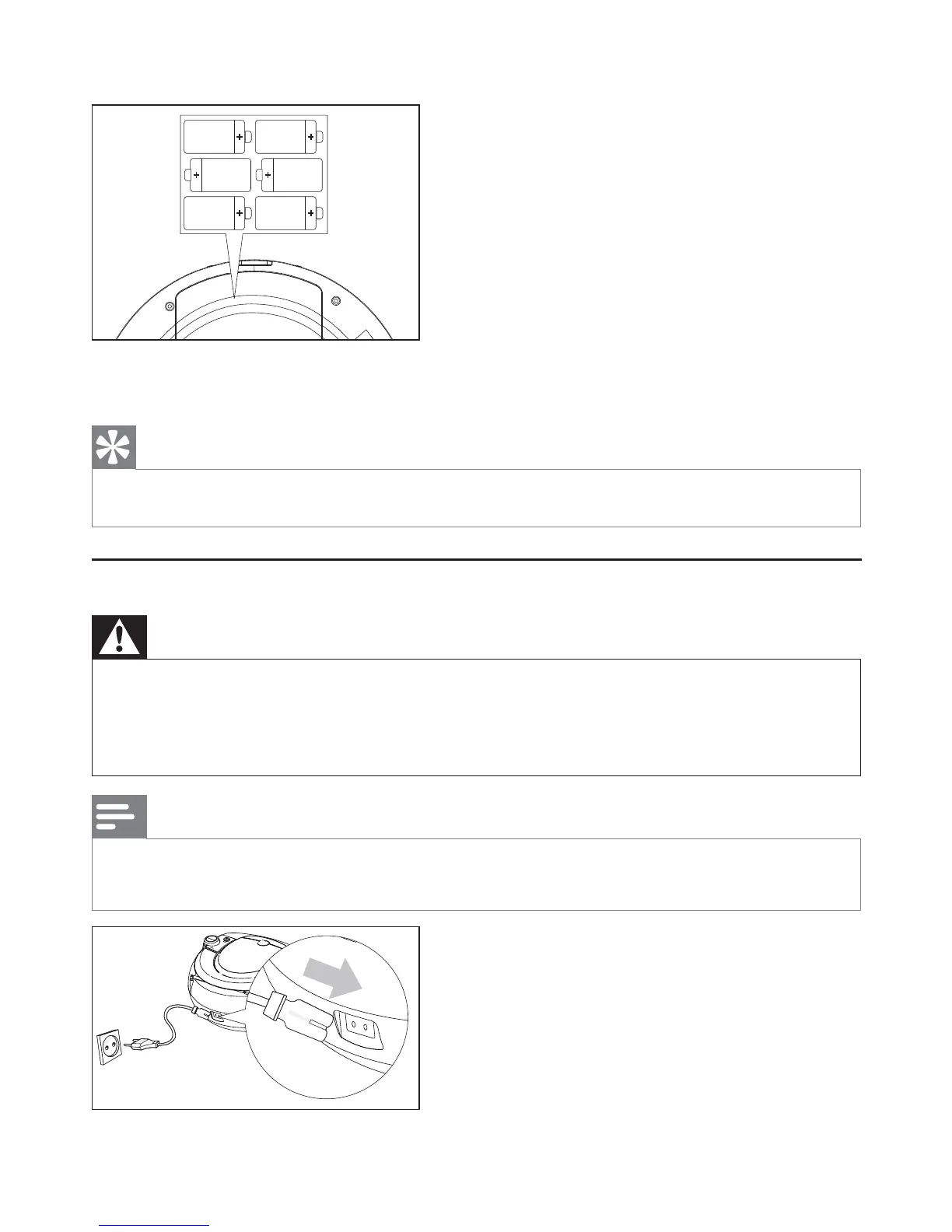 2 Insert 6 x 1.5V R14/UM-2/C-cell batteries with correct polarity (+/-) as indicated.