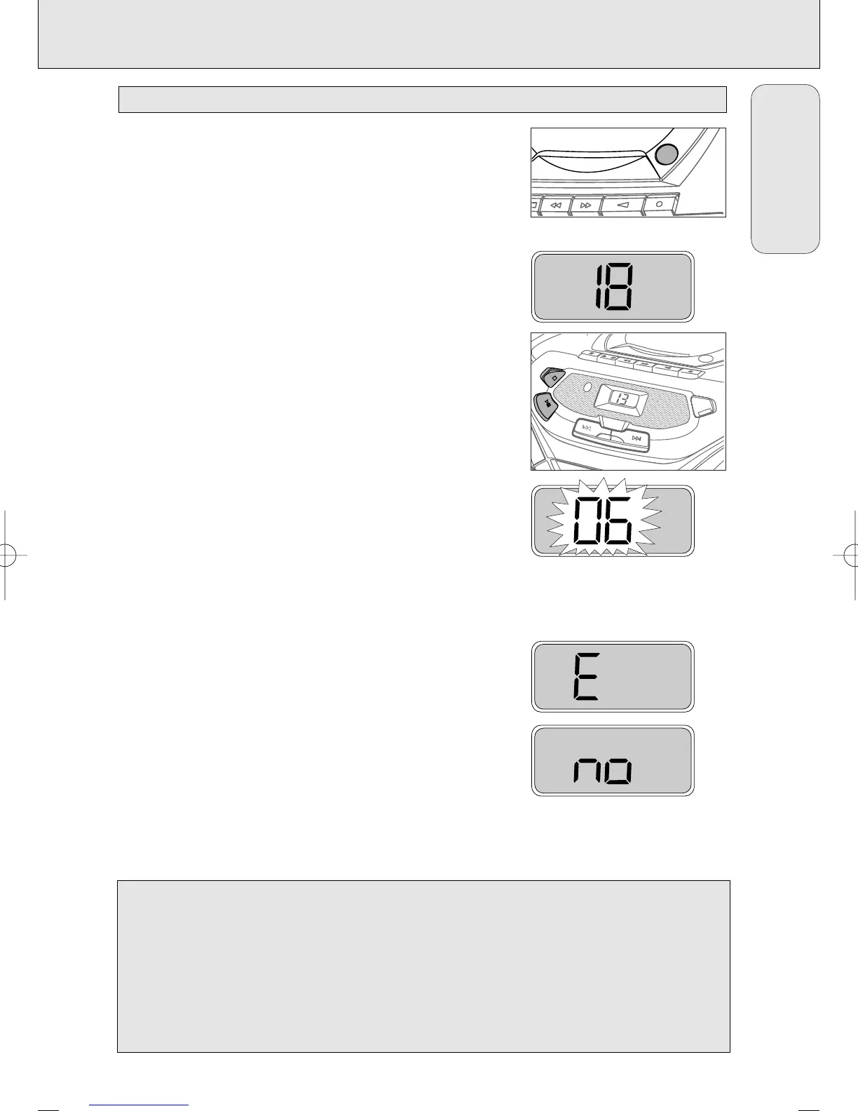 CD player cannot read the CD, the display shows E or no. (See