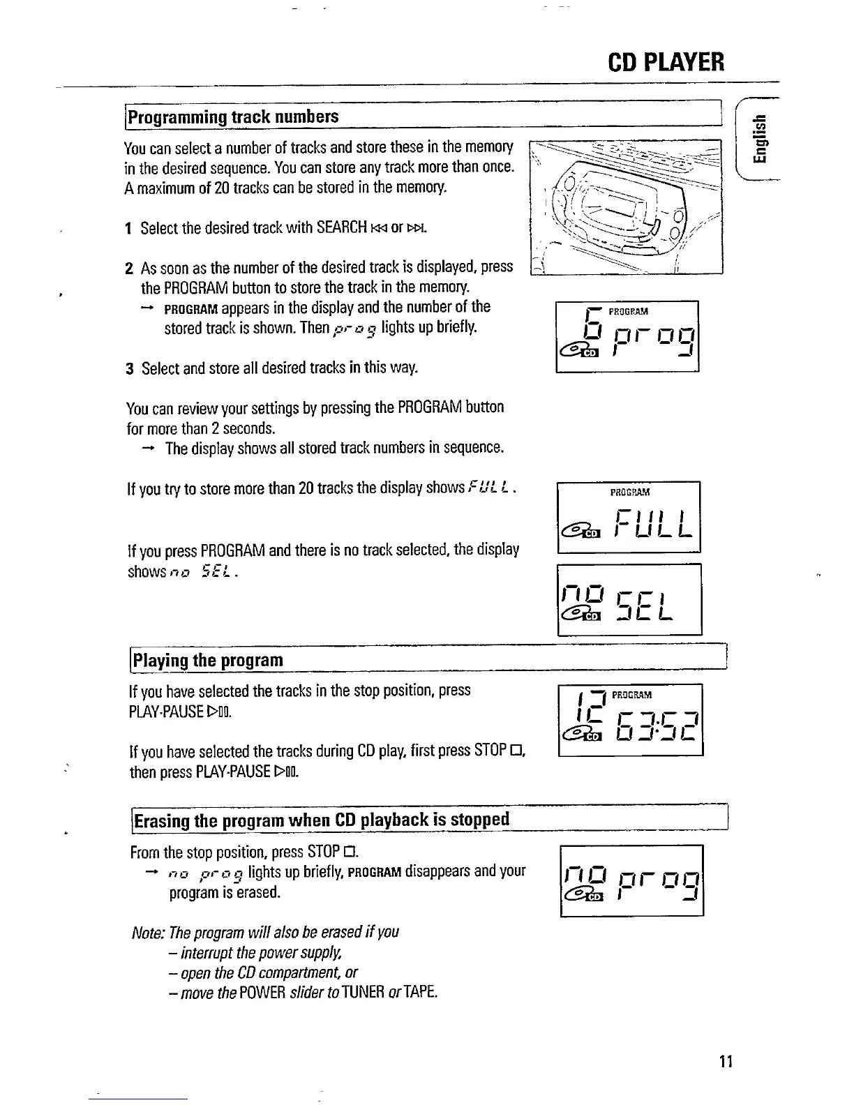 Philips AZ1209 - Programming Track Numbers; Playing a CD Program; Erasing CD Programs