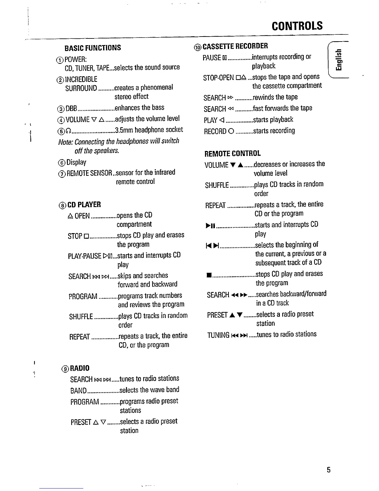 Philips AZ1209 - Basic Functions Controls; CD Player Controls; Radio Controls; Cassette Recorder Controls