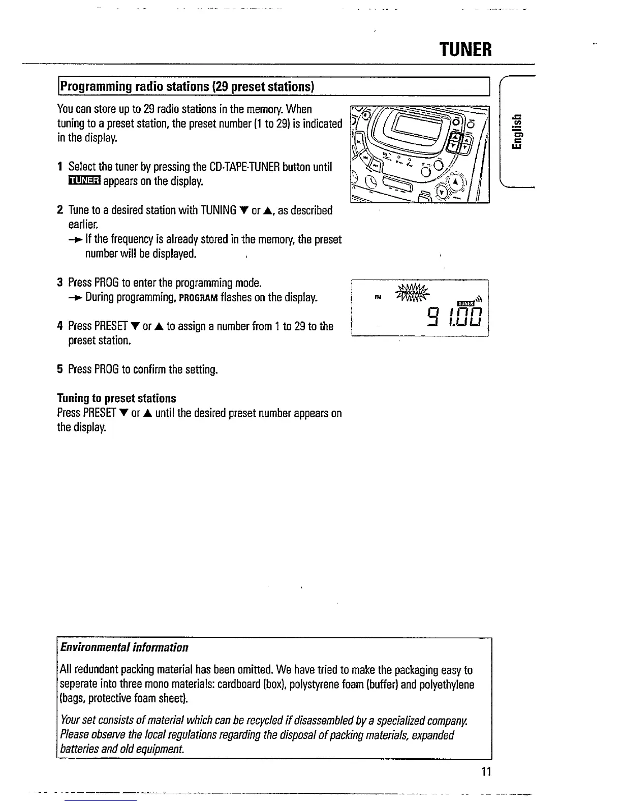Philips AZ1518 - Tuner Presets and Environmental Info; Programming and Tuning Presets