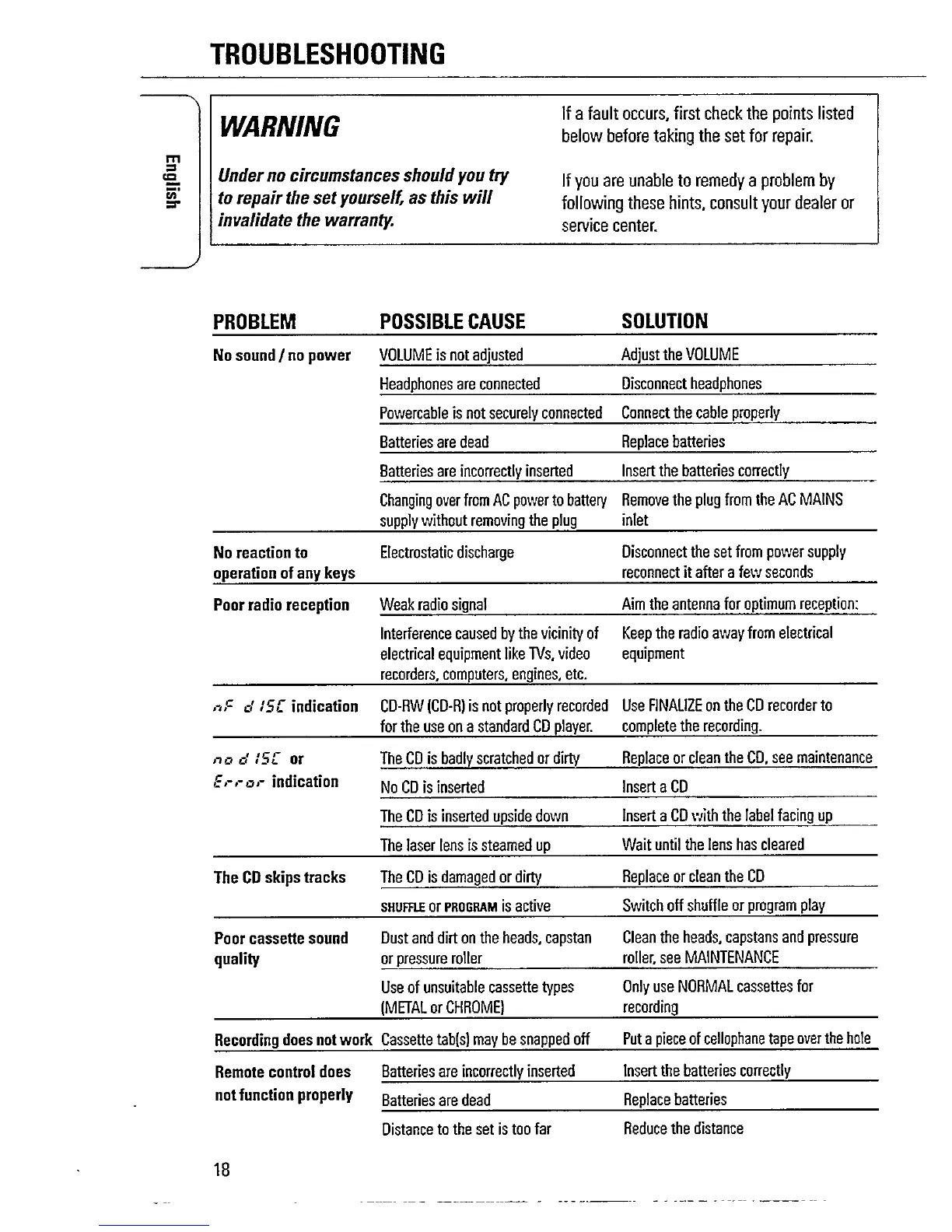 Philips AZ1518 - Troubleshooting; Power, Sound, and Keypad Issues; Radio Reception and CD Errors; Cassette Recording and Remote Control Fixes