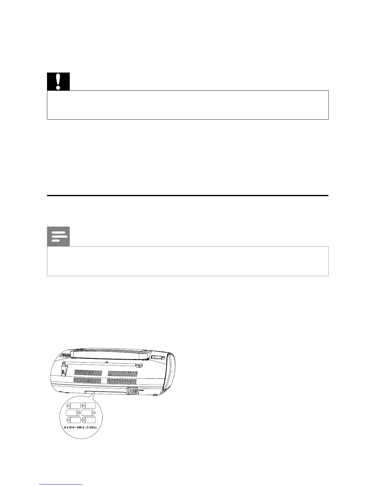 2 Insert 6 x 1.5V R14/UM-2/C-cell batteries with correct polarity (+/-) as