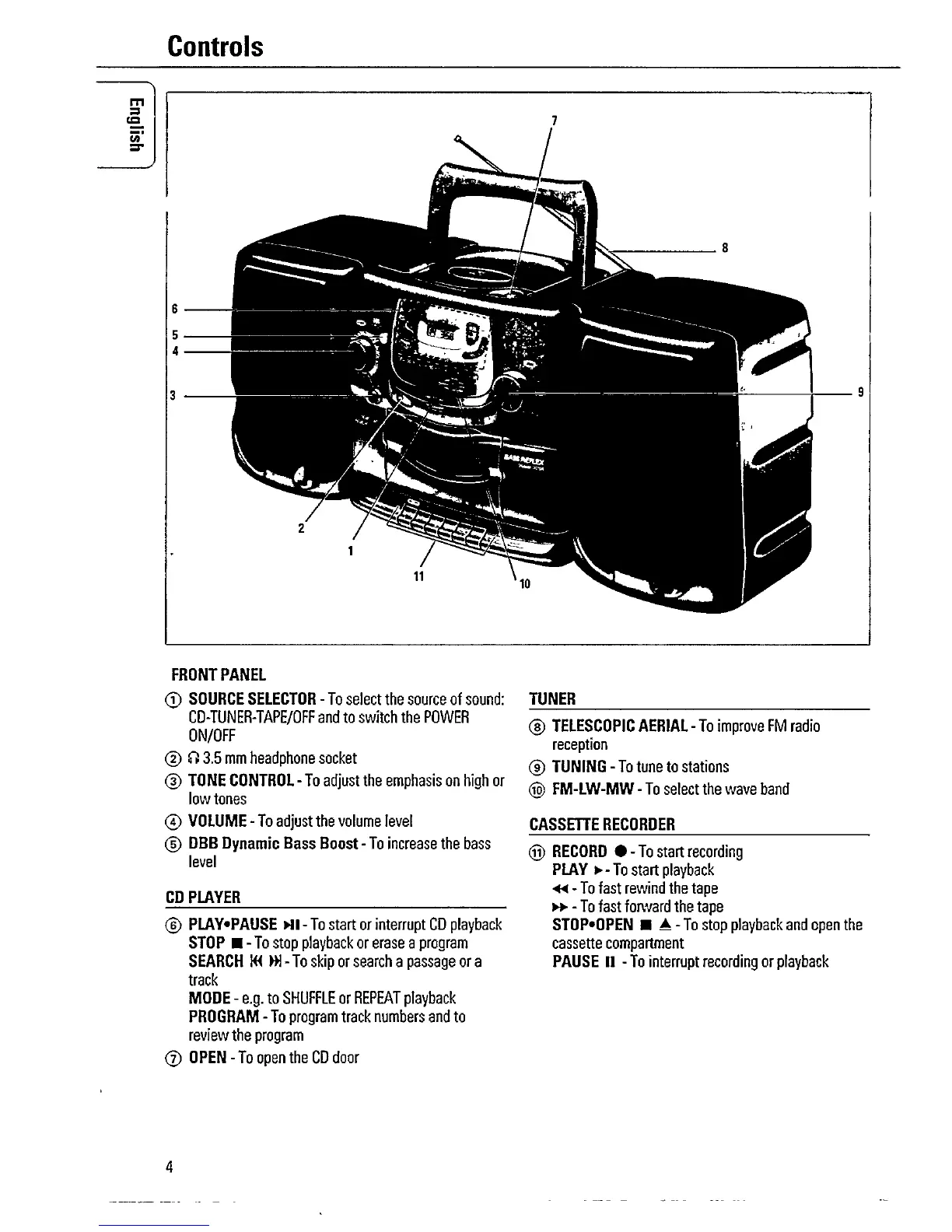 Philips AZ2100 - Controls; Front Panel Controls; Tuner Controls; Cassette Recorder Controls