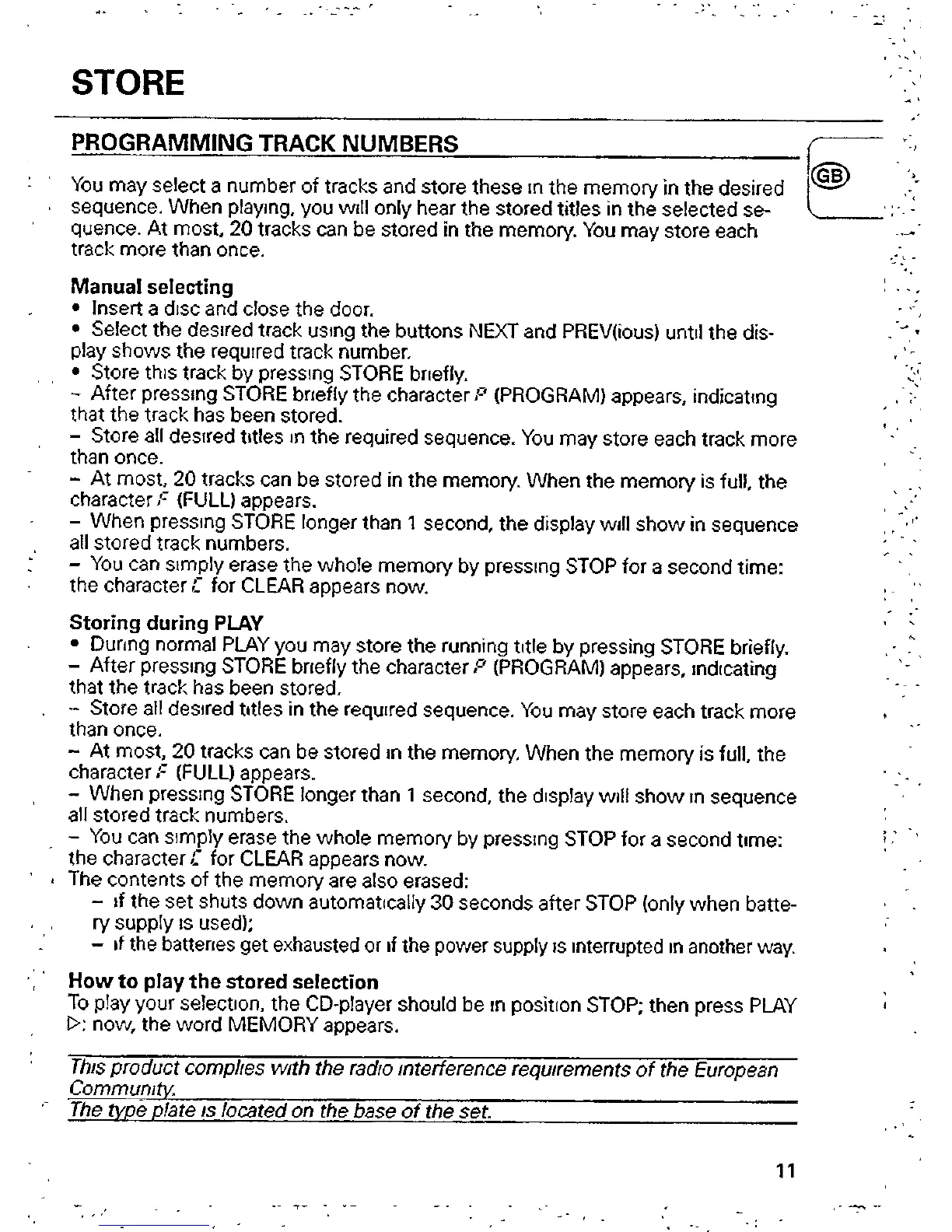Philips AZ6810 - Store; Programming Track Numbers; Manual Storing; Storing During Play