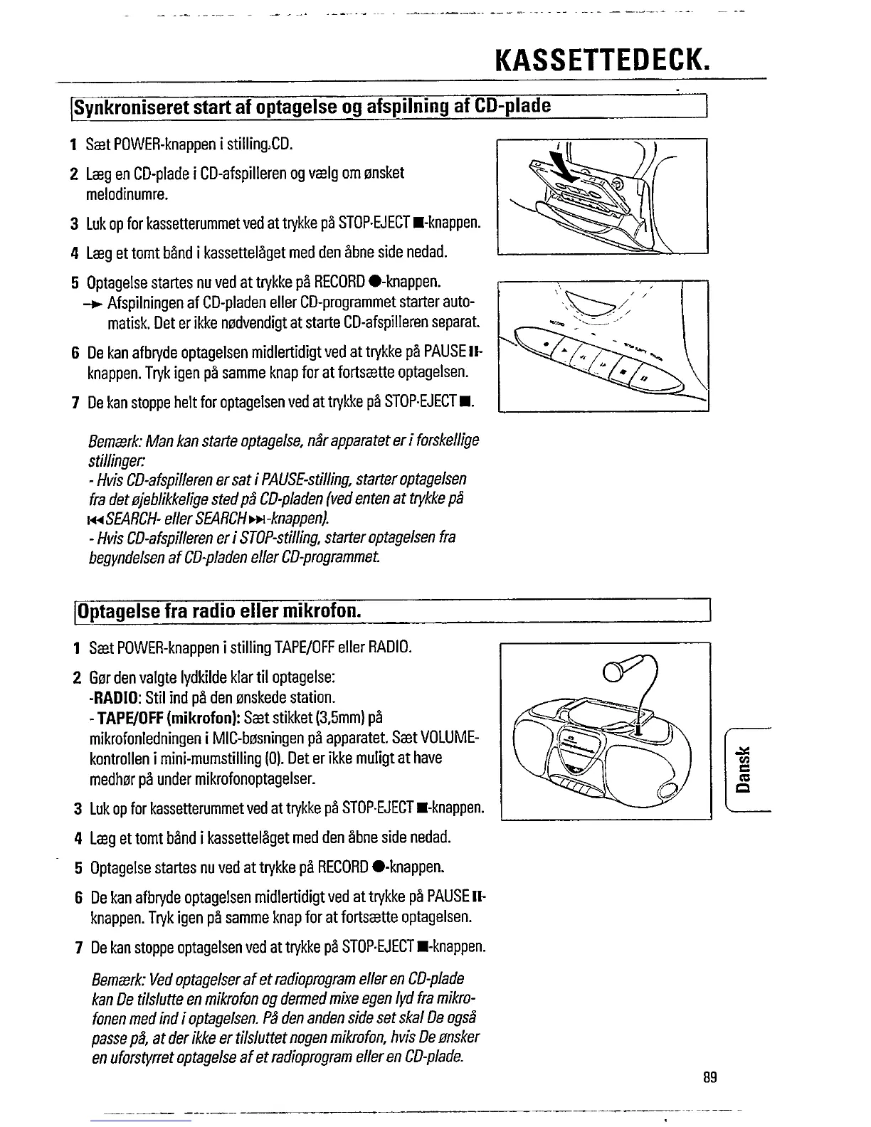 Philips AZ8267 - Cassette Recording Methods; Synchronized CD to Tape Recording; Recording from Radio or Microphone