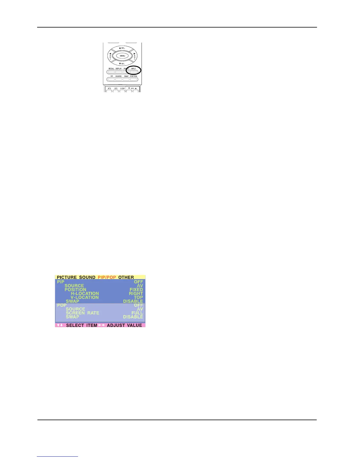 2 Use the ADJ +/- keys to switch to "PIP/POP" Menu.