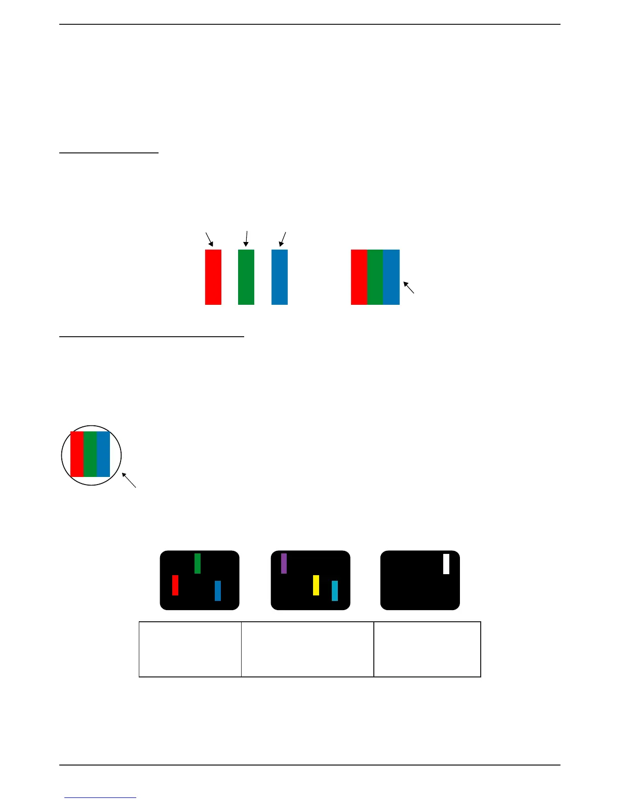 image. When all sub-pixels of a pixel are lit, the three colored sub-pixels together appear as a single white pixel. When all are dark, the