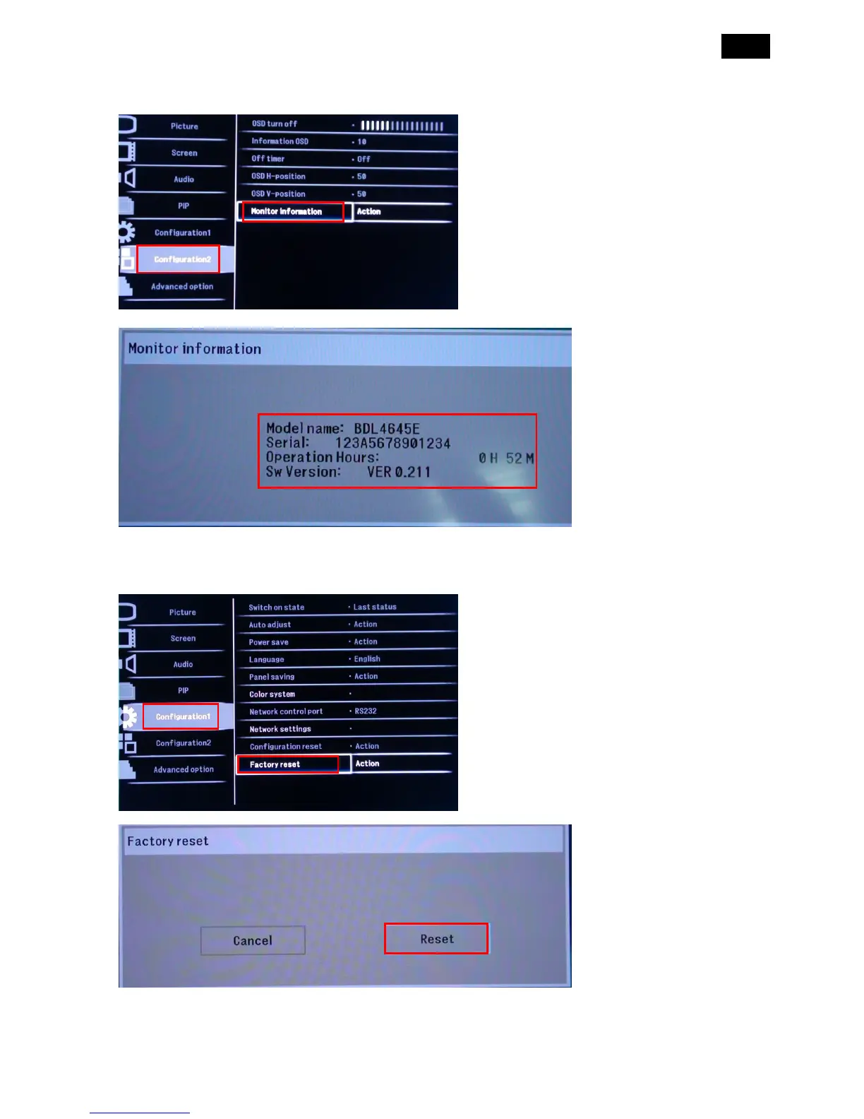1) Press “MENU” key “Configuration2” “Monitor information” “version”.