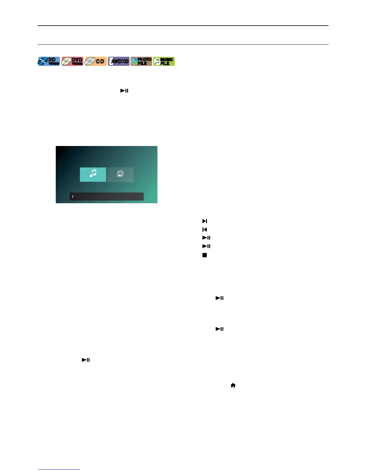 • For Blu-ray Disc™ / DVD / AVCHD / audio CD or a disc containing only one type of file, playback will start
