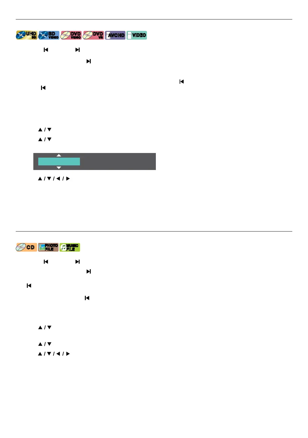 The track / file will move forward one at a time. To go back to the beginning of the current track / file, press