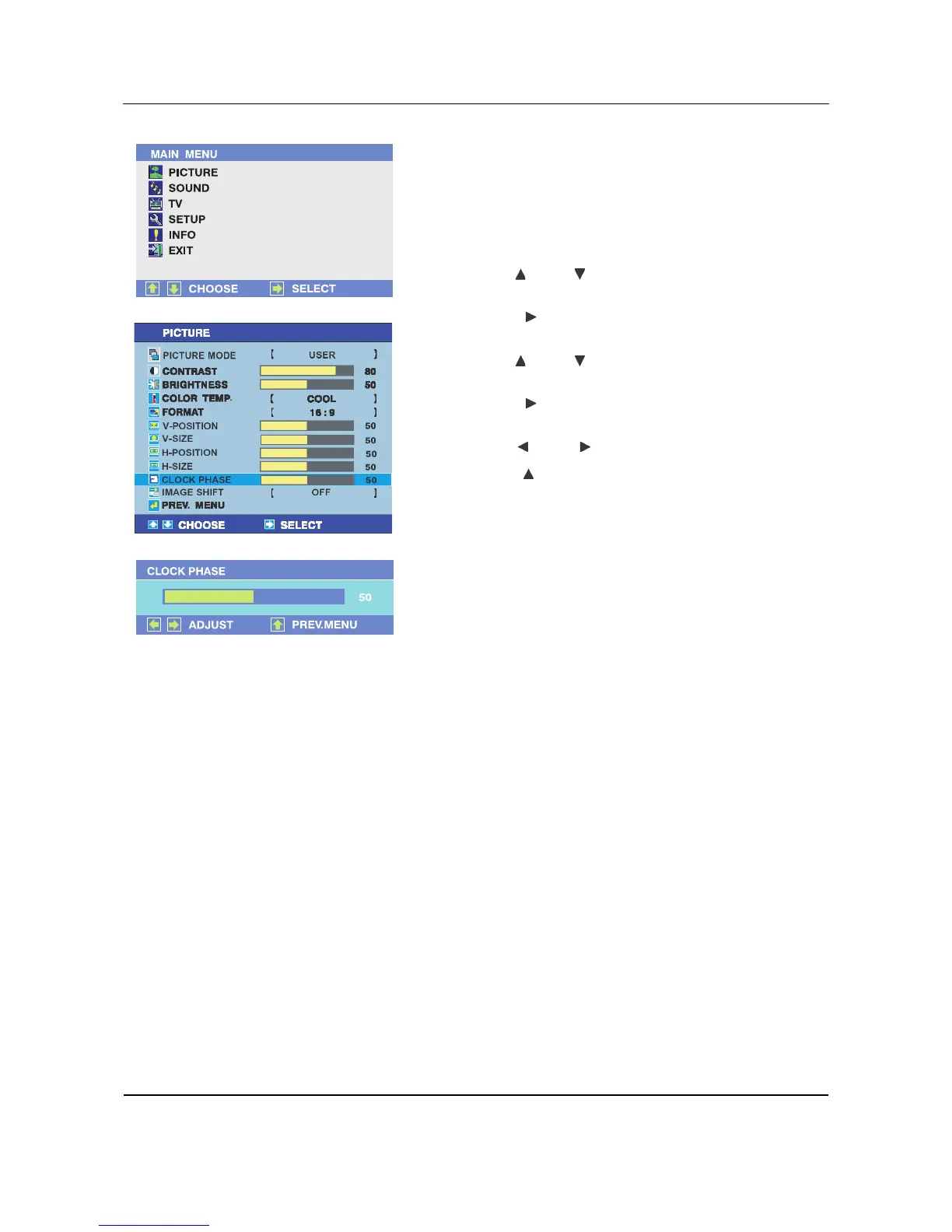 4 Use the SEL or SEL key to select the CLOCK PHASE option