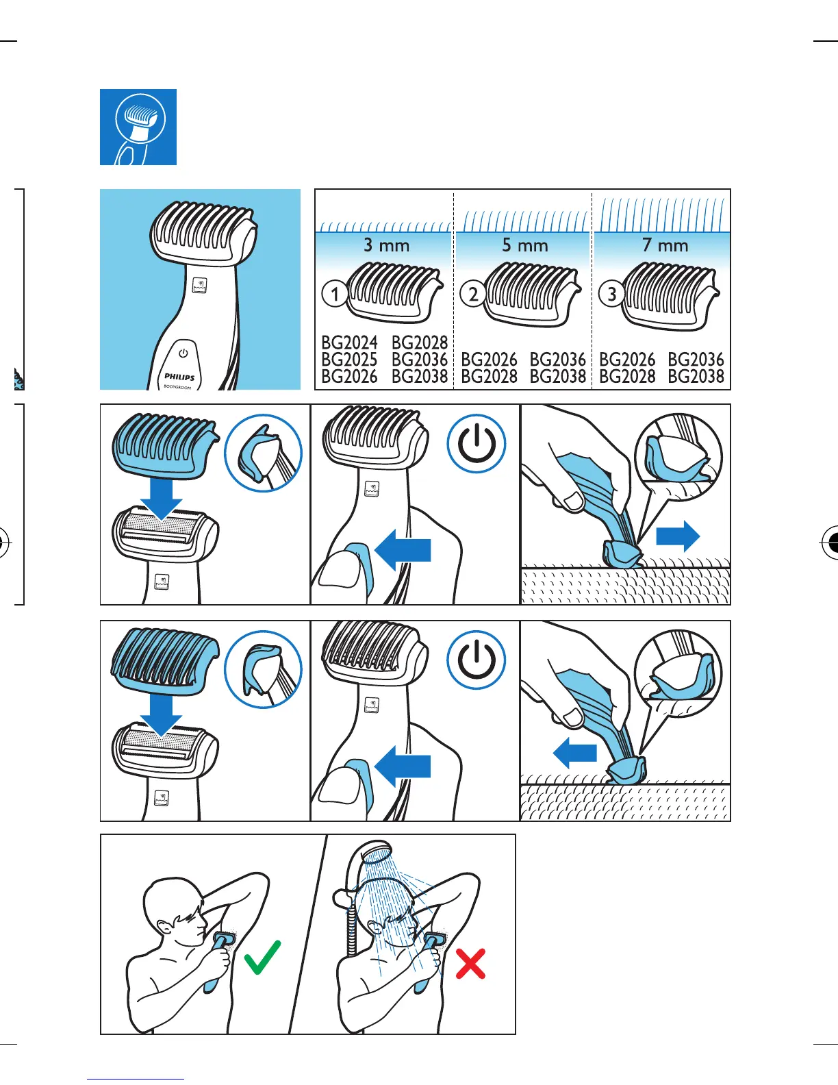 Philips BG2026 - Using Comb Attachments; Attaching and Using Comb Guards; Shaving with Comb Attachments