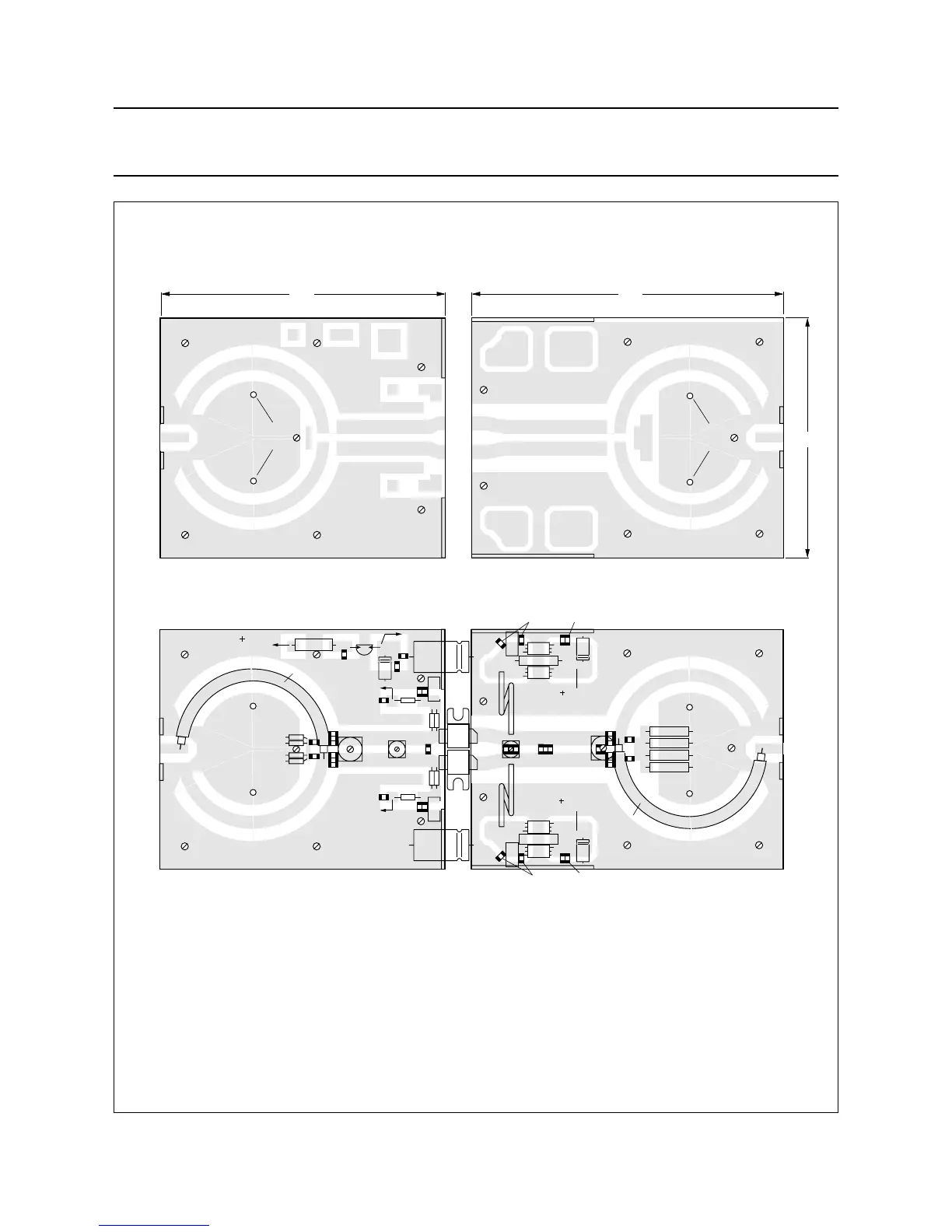 The circuit and components are situated on one side of the PTFE fibre-glass board, the other side being fully metallized to serve as an earth.