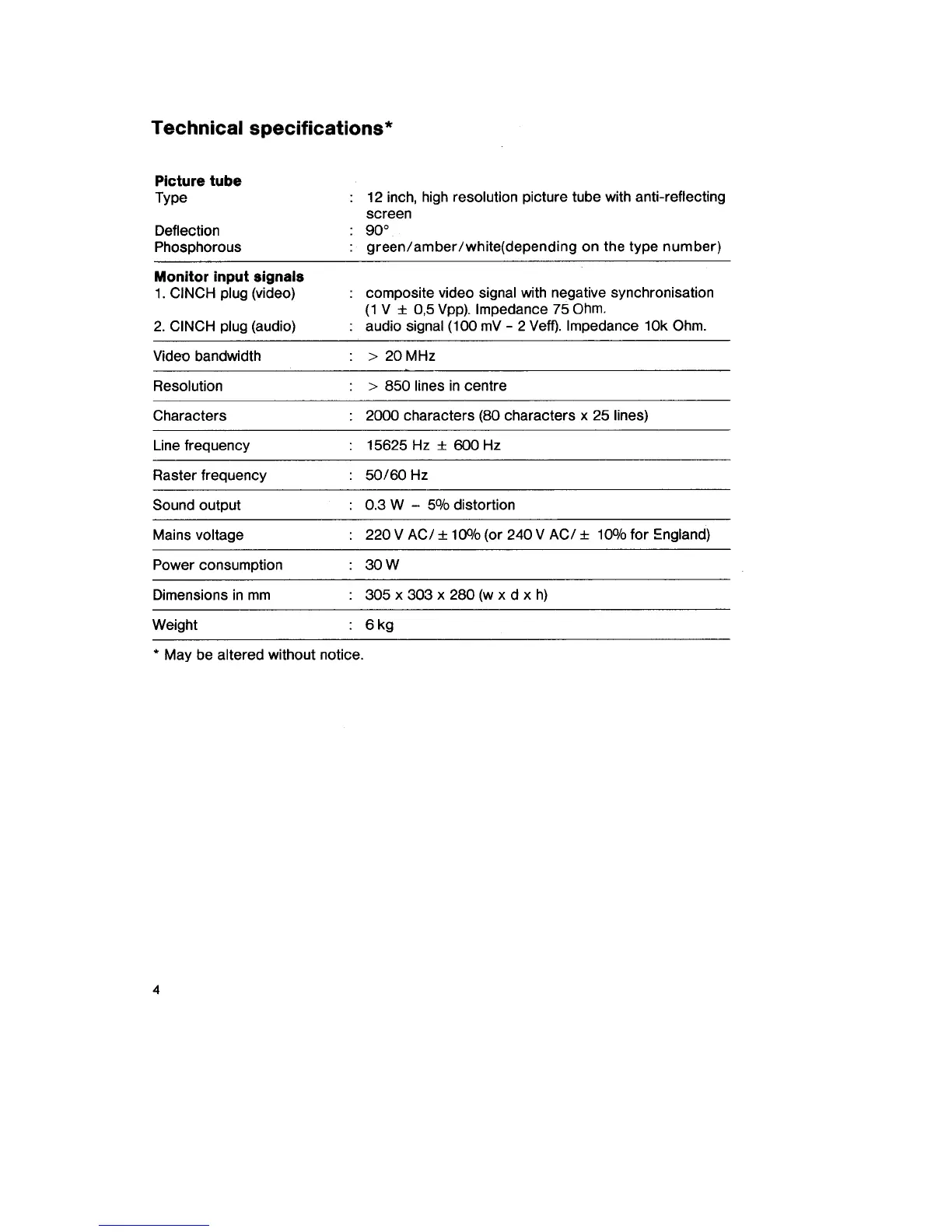Philips BM 7500 - Technical Specifications; Picture Tube and Input Signals; Performance Parameters; Power and Physical Data