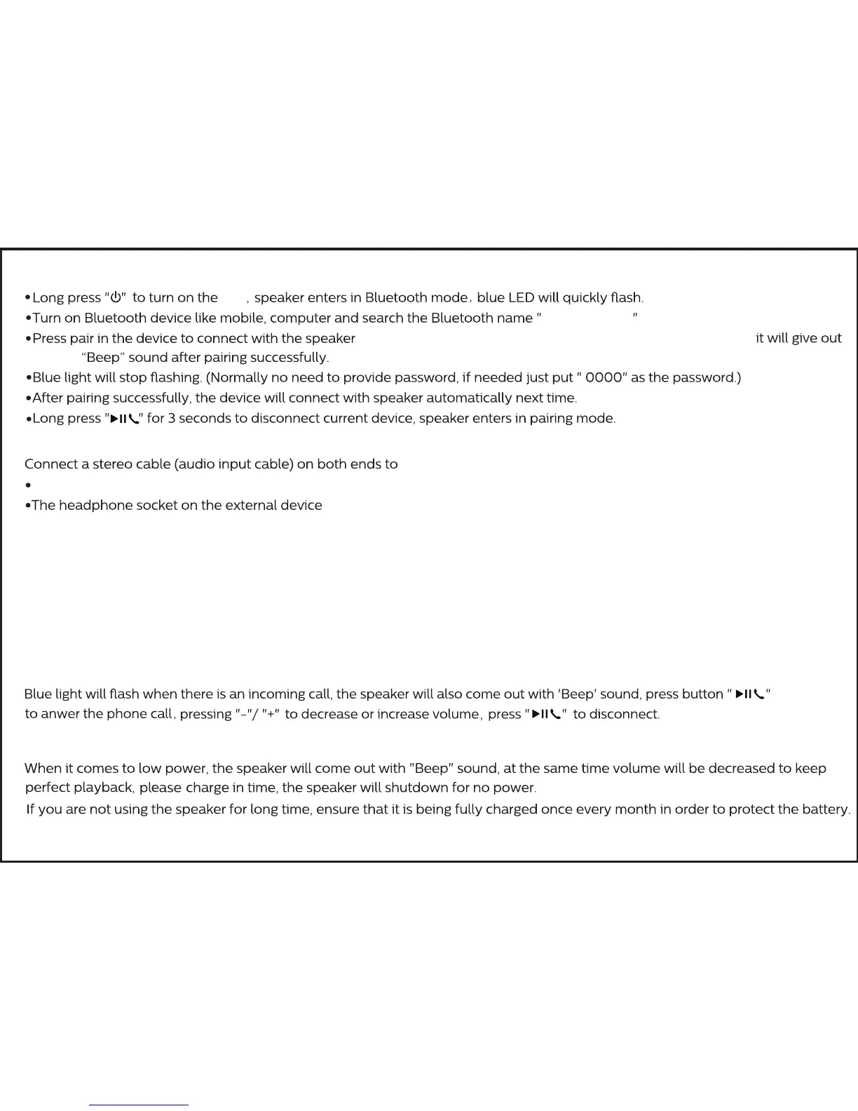 Insert stereo cable to enter audio in mode. Without stereo cable, speaker cannot go into audio in mode.
