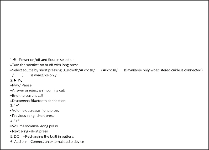 5. blue LED: bluetooth mode; green LED: Audio in mode; light blue LED: USB mode;