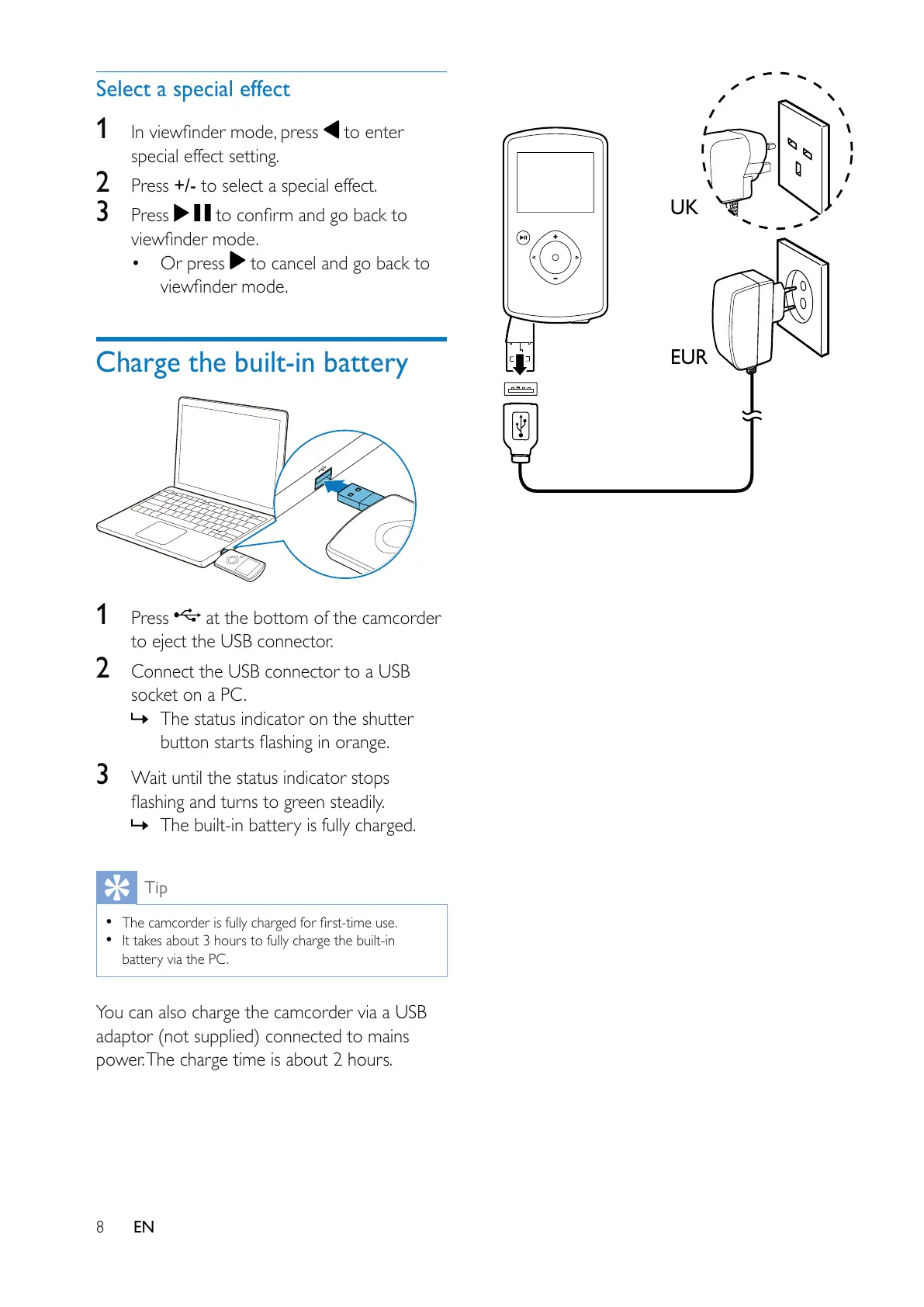 You can also charge the camcorder via a USB
