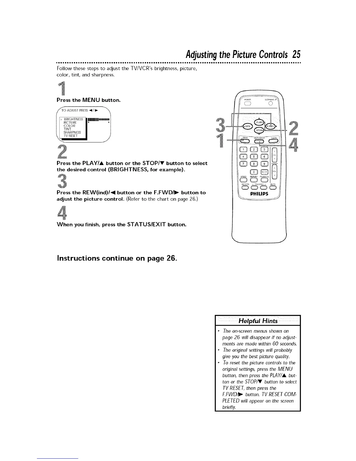 Follow these steps to adjust the TV/VCR's brightness, picture,
