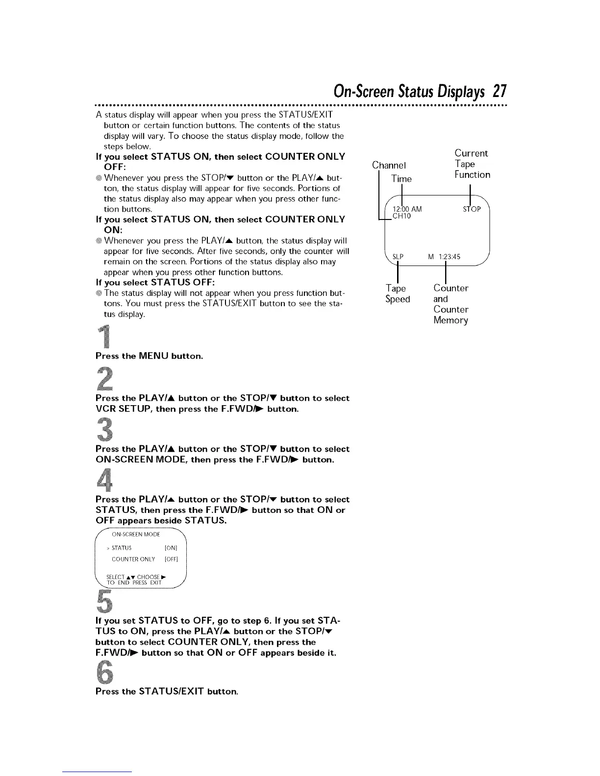 STATUS, then press the F.FWD/I_ button so that ON or