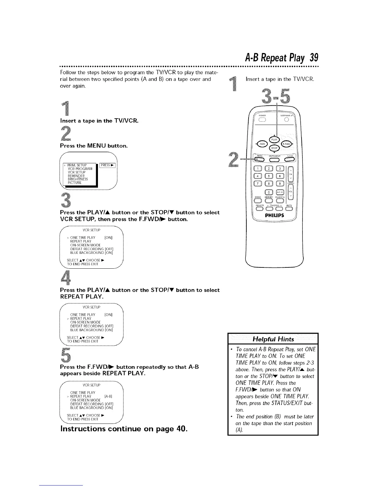rial between two specified points (A and B) on a tape over and Insert a tape in the TV/VCR