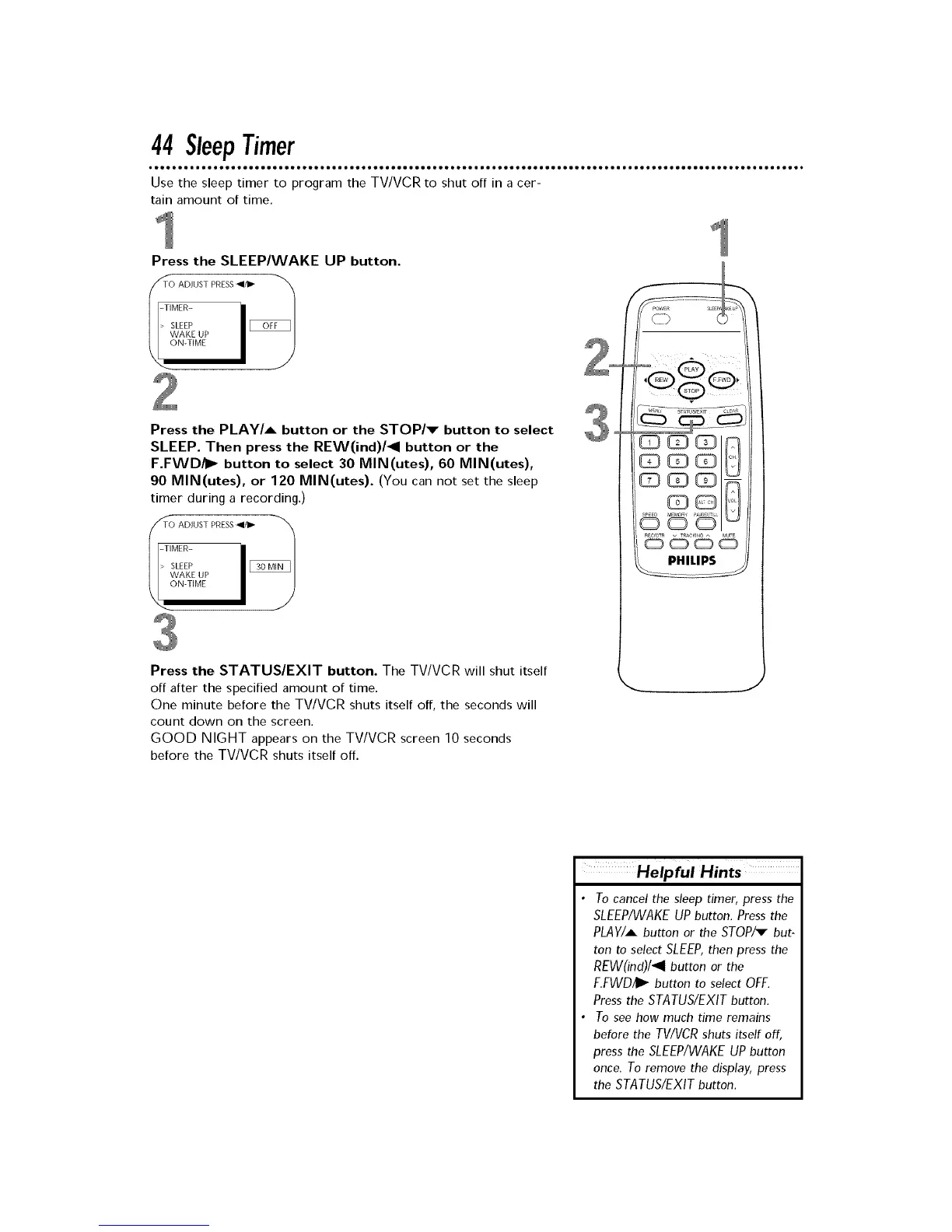 Use the sleep timer to program the TV/VCR to shut off in a cer-