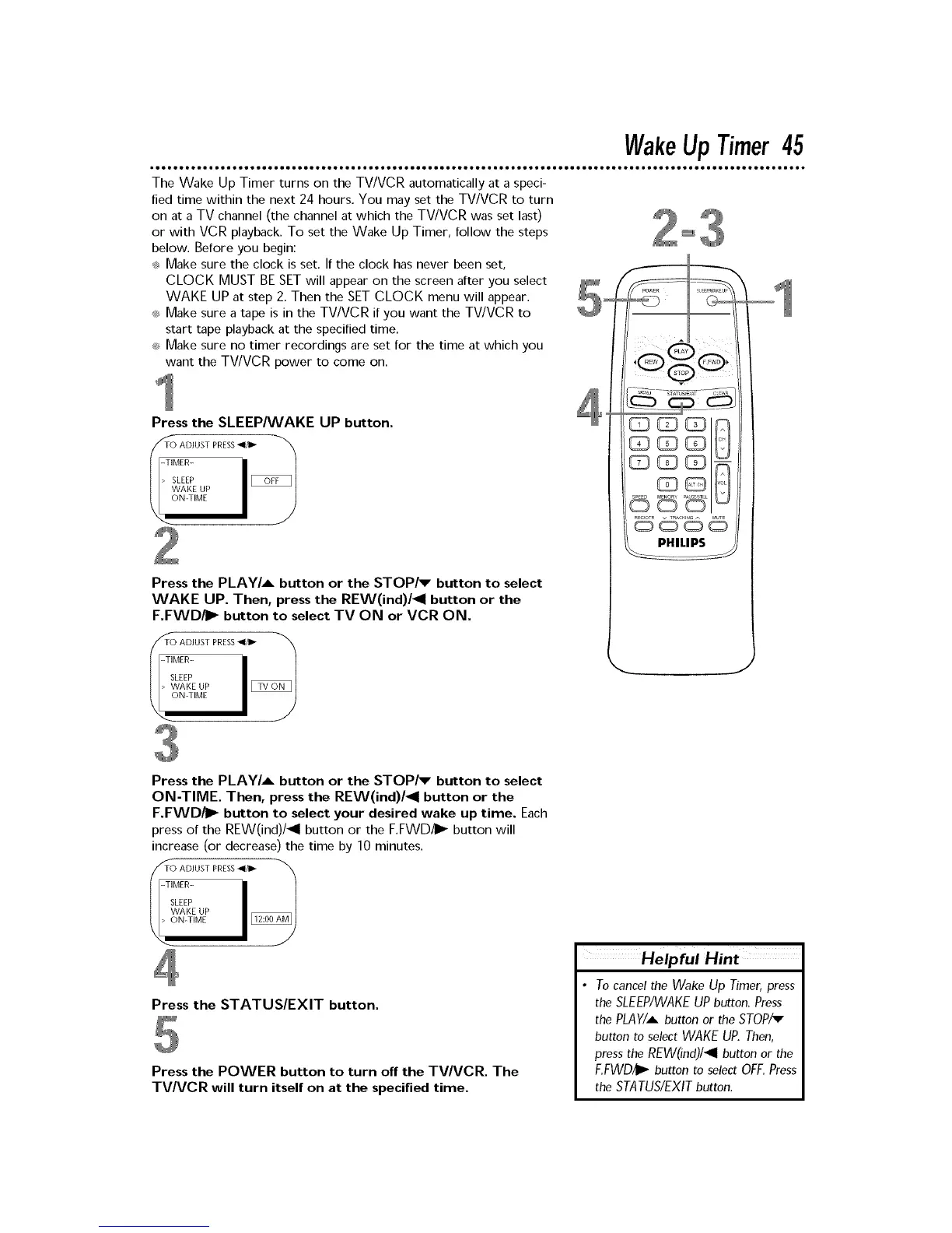 The Wake Up Timer turns on the TV/VCR automatically at a speci-