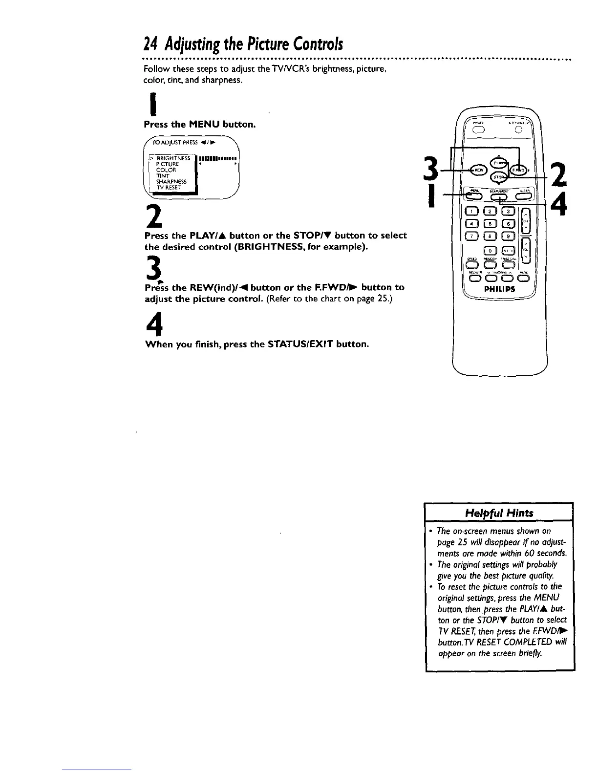 Follow these steps to adjust the TV/VCR's brightness,picture,
