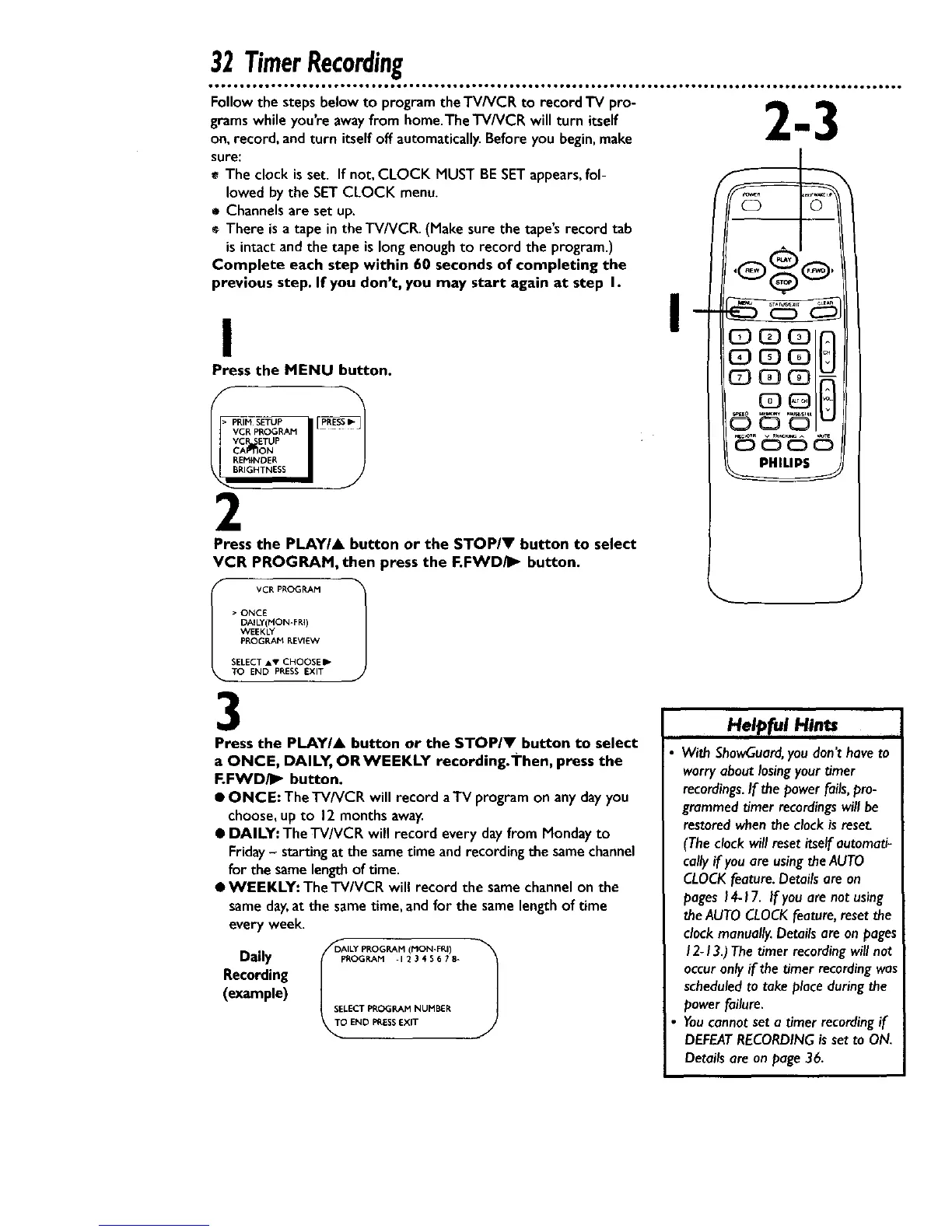 • WEEKLY: The'rV/VCR will record the same channel on the