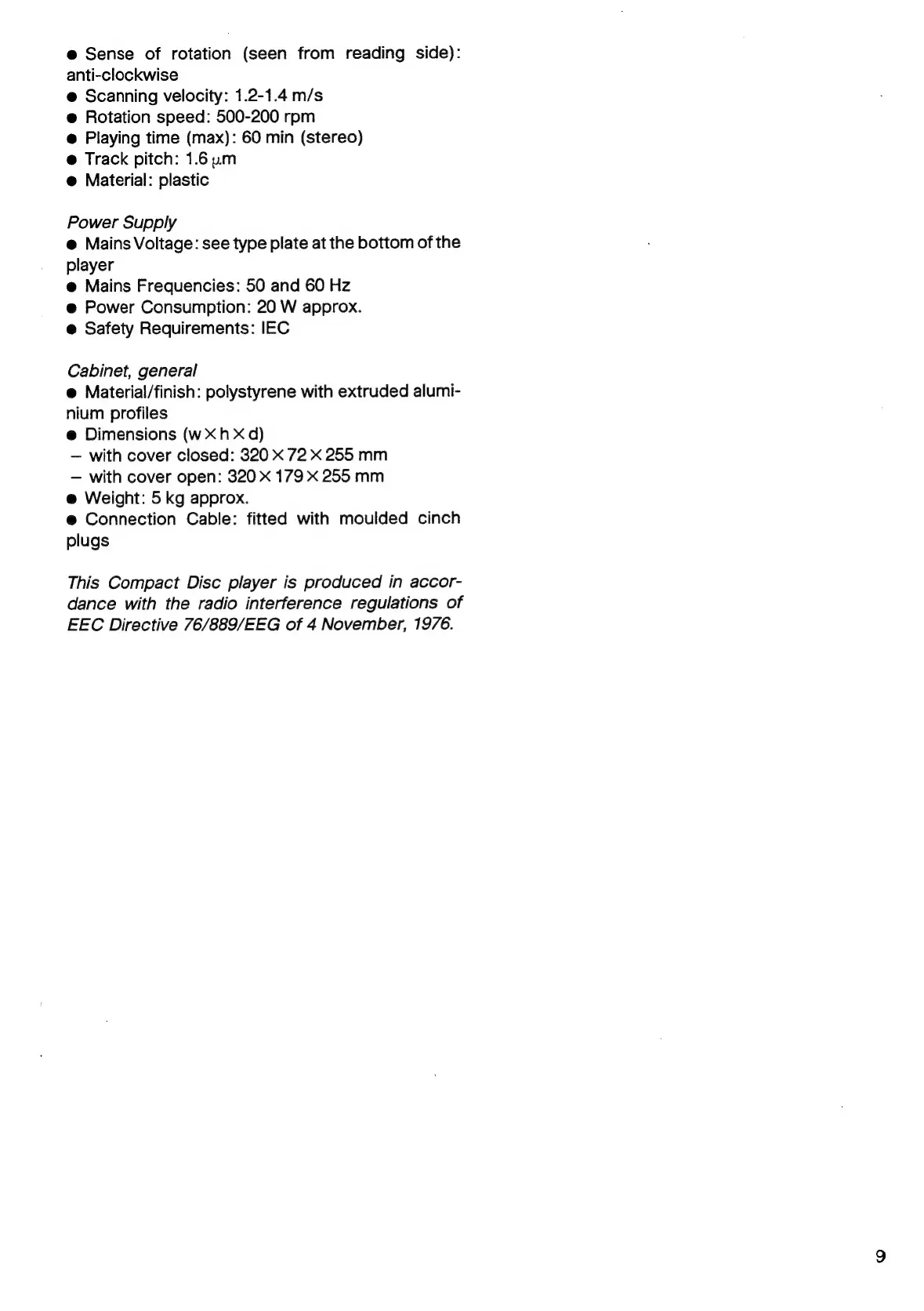 Philips CD 100 - Audio and Signal Specifications; Disc, Cabinet, and Power Details