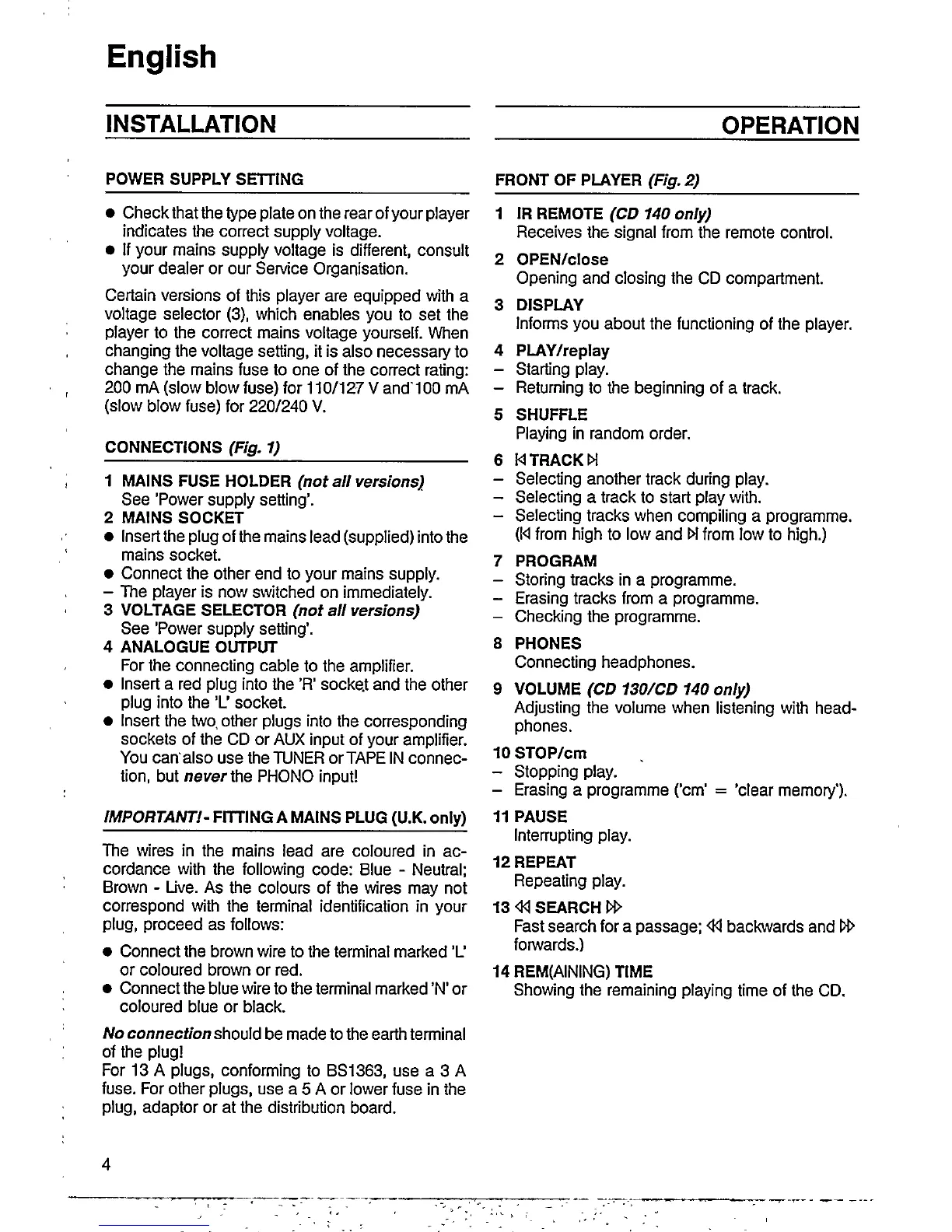 Philips CD 140 - Installation Guide; Power Supply Setting; Connections; Fitting a Mains Plug (U.K. only)