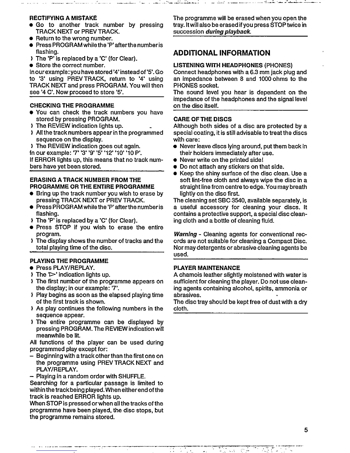 Philips CD 582 - PROGRAMME MANAGEMENT AND EXECUTION; PROGRAMME EDITING AND PLAYBACK CONTROL; ADDITIONAL INFORMATION; HEADPHONE LISTENING GUIDELINES