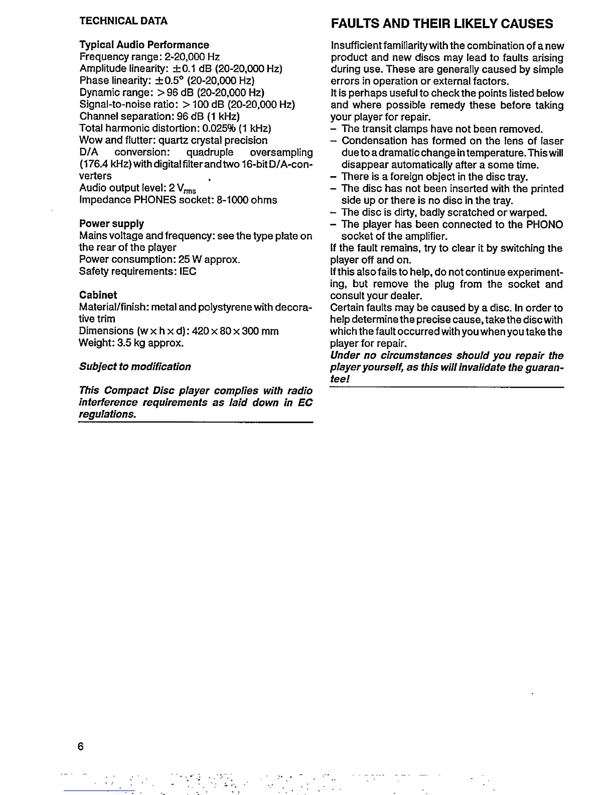 Philips CD 582 - TECHNICAL SPECIFICATIONS; TROUBLESHOOTING COMMON FAULTS