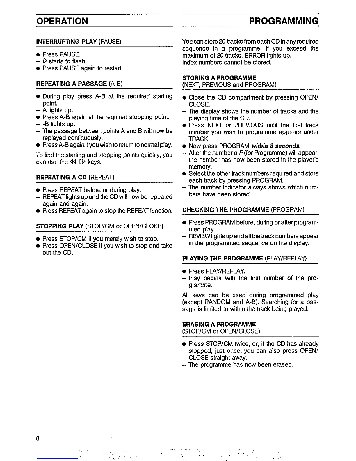 Philips CD 605 - Programming; Interrupting Play; Repeating a Passage; Repeating a CD