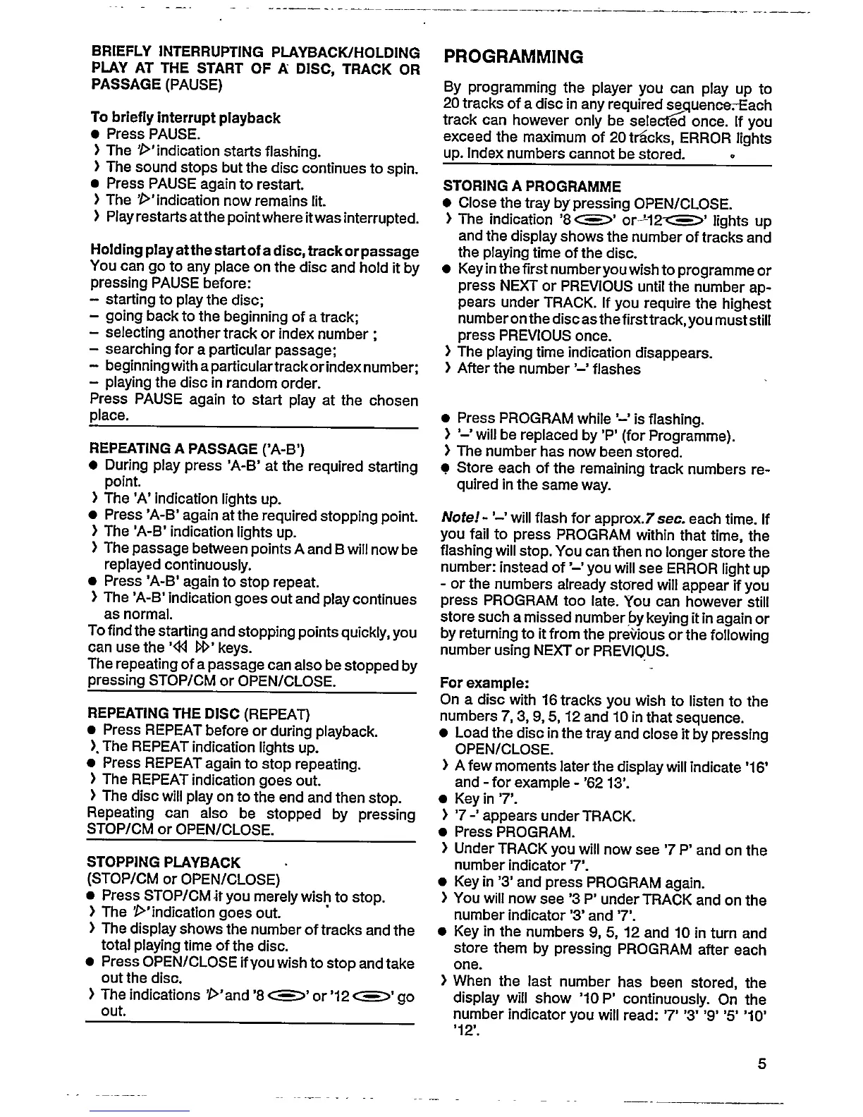 Philips CD 610 - Programming and Playback Control; Pausing and Repeating Playback; Stopping Playback and Programming