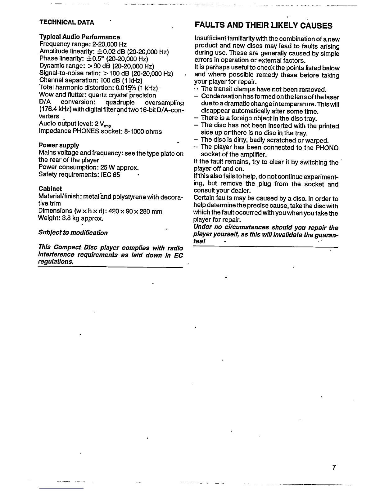 Philips CD 610 - Technical Data and Troubleshooting; Technical Specifications; Troubleshooting Common Faults