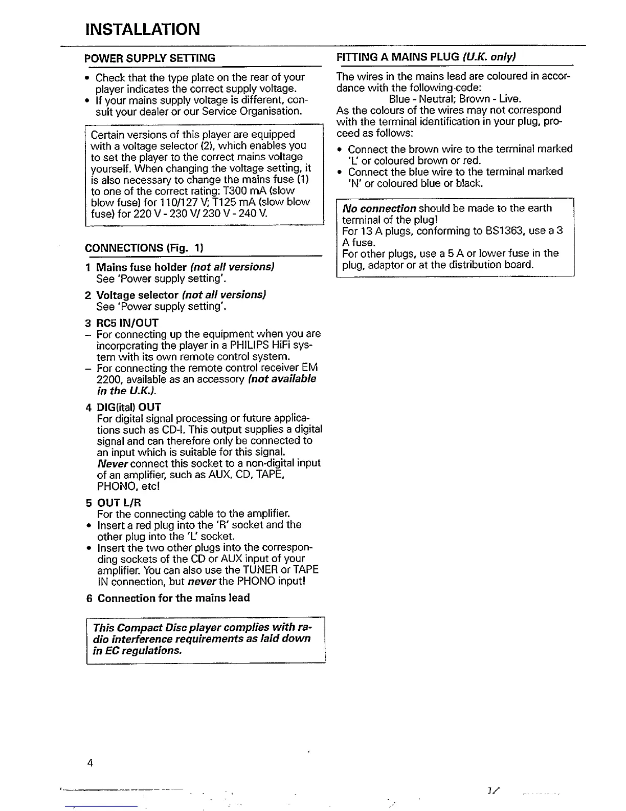 Philips CD 618 - Product Installation; Power Supply Setting; Connections; Fitting a Mains Plug (U.K. only)